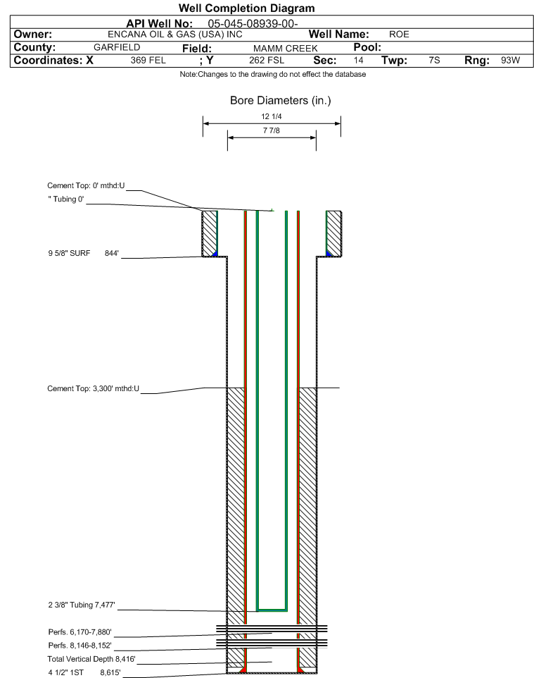 | Wellbore Completed | | Completion Date: | 5/10/2003 | | Spud Date: | 1/24/2003 | Spud Date Is: | ACTUAL | | Measured TD: | 8620 ft. | Measured PB depth: | 8534 ft. | | True Vertical TD: | 8416 ft. | True Vertical PB depth: | | | Top PZ Location: | Sec:14 Twp: 7S 93W | Footage: 1326 FSL 44 FWL | | Bottom Hole Location: | Sec:14 Twp: 7S 93W | Footage: 1325 FSL 50 FWL | | Log Types: | AI / LC / GR, CBL, CN / LD / GR | | Casing: | String Type: SURF, Hole Size: 12.25 in., Size: 9.625 in., Top: , Depth: 844 ft., Weight: 24 , Citings Type: ACTUAL | | Cement: | Sacks: 450, Top: , Bottom: 860 ft., Determination Method: CALC | | Casing: | String Type: 1ST, Hole Size: 7.875 in., Size: 4.5 in., Top: , Depth: 8615 ft., Weight: 11.6 , Citings Type: ACTUAL | | Cement: | Sacks: 1465, Top: 3300 ft., Bottom: 8515 ft., Determination Method: CBL | | Formation | Interval Top | Log Bottom | Cored | DSTs | | WASATCH | 0 ft. | 5032 ft. | N | N | | WILLIAMS FORK | 5033 ft. | 8099 ft. | N | N | | ROLLINS | 8100 ft. | 8620 ft. | N | N |
