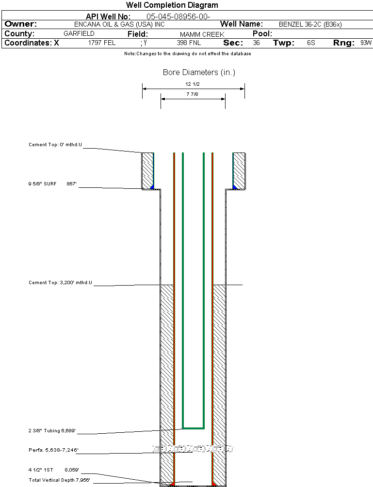 | Wellbore Completed | | Completion Date: | 2/14/2003 | | Spud Date: | 12/23/2002 | Spud Date Is: | ACTUAL | | Measured TD: | 8059 ft. | Measured PB depth: | 0 ft. | | True Vertical TD: | 7956 ft. | True Vertical PB depth: | 8014 ft. | | Top PZ Location: | Sec:36 Twp: 6S 93W | Footage: 658 FNL 2644 FEL | | Bottom Hole Location: | Sec:36 Twp: 6S 93W | Footage: 660 FNL 2660 FEL | | Log Types: | CV/CL/GR, AI/LC/GR, CN/TLD/GR, PDK-100/GR-CCL, BAL/GR | | Casing: | String Type: SURF, Hole Size: 12.5 in., Size: 9.625 in., Top: 0 ft., Depth: 867 ft., Weight: 36 , Citings Type: ACTUAL | | Cement: | Sacks: 450, Top: 0 ft., Bottom: 867 ft., Determination Method: CALC | | Casing: | String Type: 1ST, Hole Size: 7.875 in., Size: 4.5 in., Top: 0 ft., Depth: 8059 ft., Weight: 11.6 , Citings Type: ACTUAL | | Cement: | Sacks: 1065, Top: 3200 ft., Bottom: 8059 ft., Determination Method: CALC | | Formation | Interval Top | Log Bottom | Cored | DSTs | | WASATCH | 0 ft. | 4409 ft. | N | N | | WILLIAMS FORK | 4410 ft. | 7588 ft. | N | N | | ROLLINS | 7589 ft. | 8059 ft. | N | N |