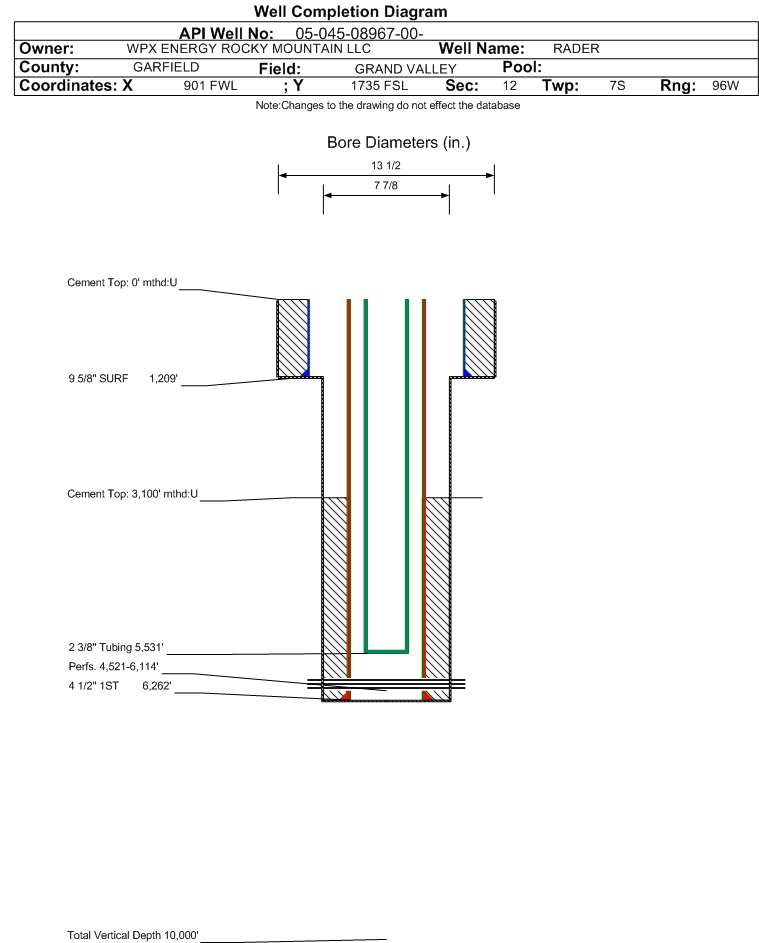 Wellbore #00 Wellbore Classification: OW Status: PR - 3/10/2003 Measured TD: 6273 ft.| Wellbore Data for Original Wellbore | Wellbore Classification: OW PR - 3/10/2003 | | Wellbore Permit | DIRECTIONAL | | Permit #: | 20021741 | Expiration Date: | 9/12/2003 | | Proposed Top PZ Location: | Sec: Twp: | Footage: 2178 FSL 1808 FWL | | Bottom Hole Location: | Sec: Twp: | Footage: 2225 FSL 1870 FWL | | Proposed Depth/Form: | 6220 ft. | | Surface Mineral Owner Same: | No | | Mineral Owner: | FEE | Surface Owner: | FEE | | Unit: | | Unit Number: | | | Formation And Spacing: | Code: WMFK , Formation: WILLIAMS FORK , Order: 479-10 , Unit Acreage: 320, Drill Unit: W/2 |