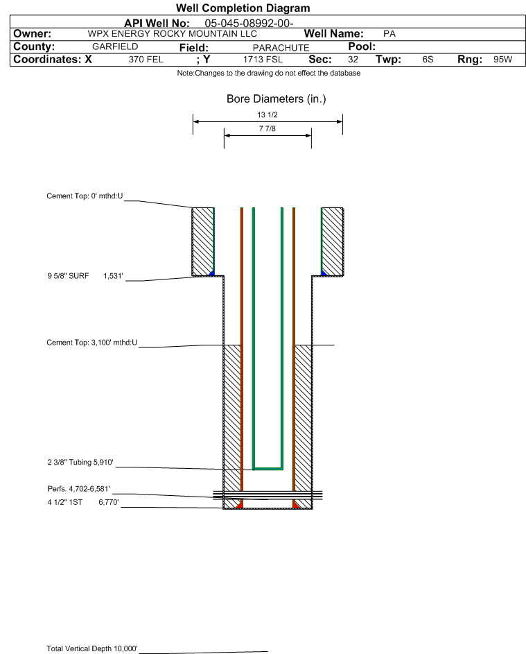 Wellbore #00 Wellbore Classification: GW Status: PR - 1/26/2003 Measured TD: 6773 ft.| Wellbore Data for Original Wellbore | Wellbore Classification: GW PR - 1/26/2003 | | Wellbore Permit | | | Permit #: | 200022047 | Expiration Date: | 11/18/2003 | | Proposed Depth/Form: | 6850 ft. | | Surface Mineral Owner Same: | Yes | | Mineral Owner: | FEE | Surface Owner: | FEE | | Unit: | | Unit Number: | | | Formation And Spacing: | Code: WMFK , Formation: WILLIAMS FORK , Order: 440-19 , Unit Acreage: , Drill Unit: |