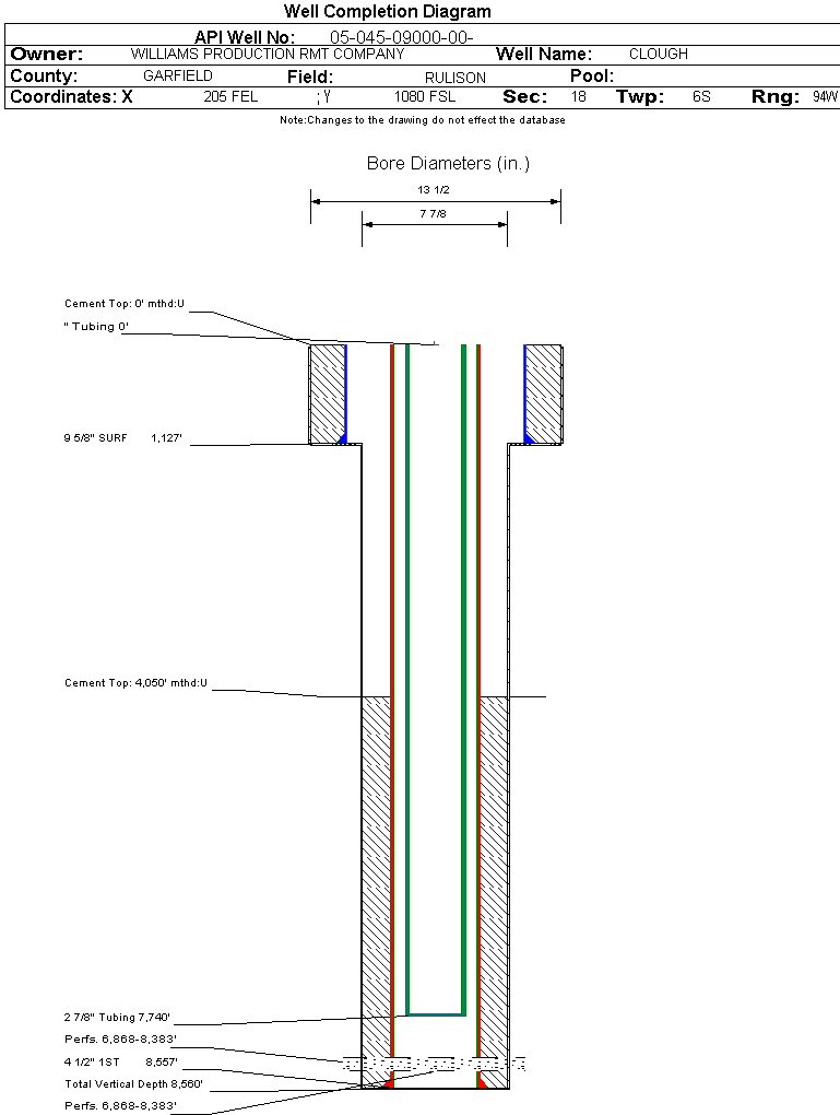 | Wellbore Completed | | Completion Date: | 4/15/2003 | | Spud Date: | 2/9/2003 | Spud Date Is: | ACTUAL | | Measured TD: | 8560 ft. | Measured PB depth: | | | True Vertical TD: | | True Vertical PB depth: | | | Top PZ Location: | Sec: Twp: | Footage: 348 FSL 294 FEL | | Bottom Hole Location: | Sec: Twp: | Footage: 300 FSL 300 FEL | | Log Types: | THERMAL MULTIGATE DECAY LOG, CBL | | Log Types: | THERMAL MULTIGATE DECAY LOG, CBL | | Casing: | String Type: SURF, Hole Size: 13.5 in., Size: 9.625 in., Top: , Depth: 1127 ft., Weight: 32.3 , Citings Type: ACTUAL | | Cement: | Sacks: 490, Top: , Bottom: 1127 ft., Determination Method: CALC | | Casing: | String Type: 1ST, Hole Size: 7.875 in., Size: 4.5 in., Top: , Depth: 8557 ft., Weight: 11.6 , Citings Type: ACTUAL | | Cement: | Sacks: 1100, Top: 4050 ft., Bottom: 8557 ft., Determination Method: CBL | | Formation | Interval Top | Log Bottom | Cored | DSTs | | J SAND | 2382 ft. | | N | N | | MESAVERDE | 4817 ft. | | N | N | | CAMEO COAL | 7533 ft. | | N | N | | ROLLINS | 8453 ft. | | N | N |