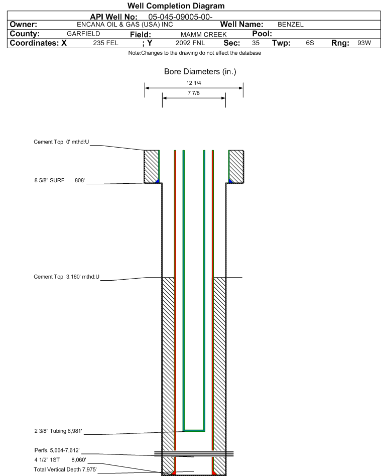 | | Tubing Size: | 2.375 in. | Tubing Setting Depth: | 6981 ft. | | Tubing Packer Depth: | | Tubing Multiple Packer: | | | Open Hole Top: | | Open Hole Bottom: | | | Initial Test Data: | | Test Date: | N/A | Test Method: | | | Hours Tested: | | Gas Type: | | | Gas Disposal: | | |