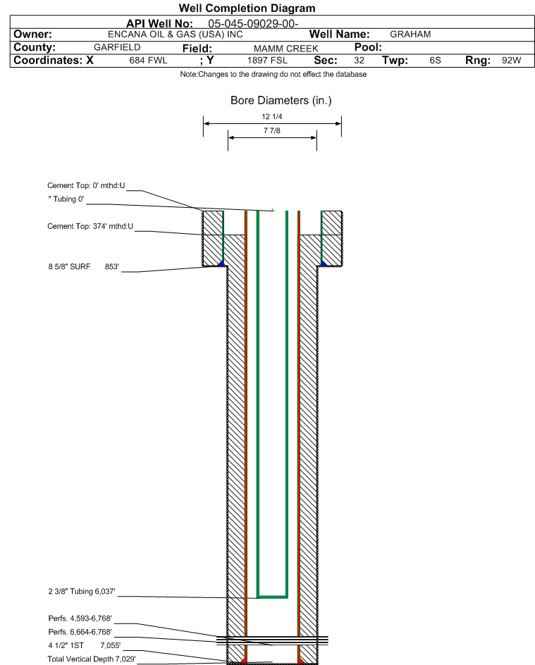 | Wellbore Completed | | Completion Date: | 6/6/2003 | | Spud Date: | 1/15/2003 | Spud Date Is: | ACTUAL | | Measured TD: | 7065 ft. | Measured PB depth: | | | True Vertical TD: | 7029 ft. | True Vertical PB depth: | 7003 ft. | | Top PZ Location: | Sec: Twp: | Footage: 1401 FSL 1105 FWL | | Bottom Hole Location: | Sec: Twp: | Footage: 1400 FSL 1110 FWL | | Log Types: | CBL / GR / CCL, AI / CL, CB / TD / GR, CV / CP | | Casing: | String Type: SURF, Hole Size: 12.25 in., Size: 8.625 in., Top: , Depth: 853 ft., Weight: 24 , Citings Type: ACTUAL | | Cement: | Sacks: 450, Top: , Bottom: 853 ft., Determination Method: CALC | | Casing: | String Type: 1ST, Hole Size: 7.875 in., Size: 4.5 in., Top: , Depth: 7055 ft., Weight: 11.6 , Citings Type: ACTUAL | | Cement: | Sacks: 1340, Top: 374 ft., Bottom: 7056 ft., Determination Method: CBL | | Formation | Interval Top | Log Bottom | Cored | DSTs | | WASATCH | 0 ft. | 3506 ft. | N | N | | WILLIAMS FORK | 3507 ft. | 6704 ft. | N | N | | ROLLINS | 6705 ft. | 7065 ft. | N | N |