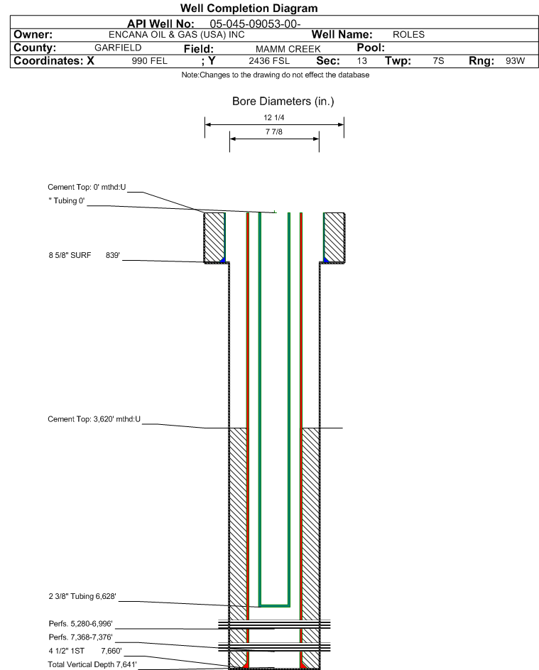 | Wellbore Completed | | Completion Date: | 9/22/2003 | | Spud Date: | 5/17/2003 | Spud Date Is: | ACTUAL | | Measured TD: | 7660 ft. | Measured PB depth: | 7570 ft. | | True Vertical TD: | 7641 ft. | True Vertical PB depth: | | | Top PZ Location: | Sec: Twp: | Footage: 2629 FSL 1301 FEL | | Bottom Hole Location: | Sec:13 Twp: | Footage: 2660 FSL 1310 FEL | | Log Types: | CBL/GR/COL, PE/AI/GR | | Casing: | String Type: SURF, Hole Size: 12.25 in., Size: 8.625 in., Top: 0 ft., Depth: 839 ft., Weight: 24 , Citings Type: ACTUAL | | Cement: | Sacks: 450, Top: 0 ft., Bottom: 821 ft., Determination Method: CALC | | Casing: | String Type: 1ST, Hole Size: 7.875 in., Size: 4.5 in., Top: 0 ft., Depth: 7660 ft., Weight: 11.6 , Citings Type: ACTUAL | | Cement: | Sacks: 1220, Top: 3620 ft., Bottom: 7660 ft., Determination Method: CBL | | Formation | Interval Top | Log Bottom | Cored | DSTs | | WASATCH | 0 ft. | 4300 ft. | N | N | | WILLIAMS FORK | 4301 ft. | 7308 ft. | N | N | | ROLLINS | 7309 ft. | 7660 ft. | N | N |