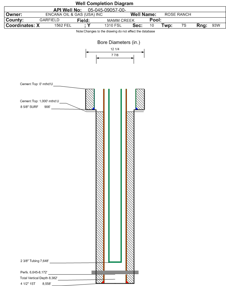 | Wellbore Completed | | Completion Date: | 7/24/2003 | | Spud Date: | 3/20/2003 | Spud Date Is: | ACTUAL | | Measured TD: | 8560 ft. | Measured PB depth: | 8385 ft. | | True Vertical TD: | 8382 ft. | True Vertical PB depth: | | | Top PZ Location: | Sec:10 Twp: | Footage: 12 FSL 1570 FEL | | Bottom Hole Location: | Sec:10 Twp: | Footage: 10 FSL 1300 FEL | | Log Types: | CBL/GR/CCL, RST/GR/CCL | | Casing: | String Type: SURF, Hole Size: 12.25 in., Size: 8.625 in., Top: 0 ft., Depth: 906 ft., Weight: 24 , Citings Type: ACTUAL | | Cement: | Sacks: 475, Top: 0 ft., Bottom: 906 ft., Determination Method: CALC | | Casing: | String Type: 1ST, Hole Size: 7.875 in., Size: 4.5 in., Top: 0 ft., Depth: 8558 ft., Weight: 11.6 , Citings Type: ACTUAL | | Cement: | Sacks: 1255, Top: 1000 ft., Bottom: 8558 ft., Determination Method: CALC | | Formation | Interval Top | Log Bottom | Cored | DSTs | | WASATCH | 0 ft. | 5998 ft. | N | N | | WILLIAMS FORK | 5999 ft. | 8560 ft. | N | N |