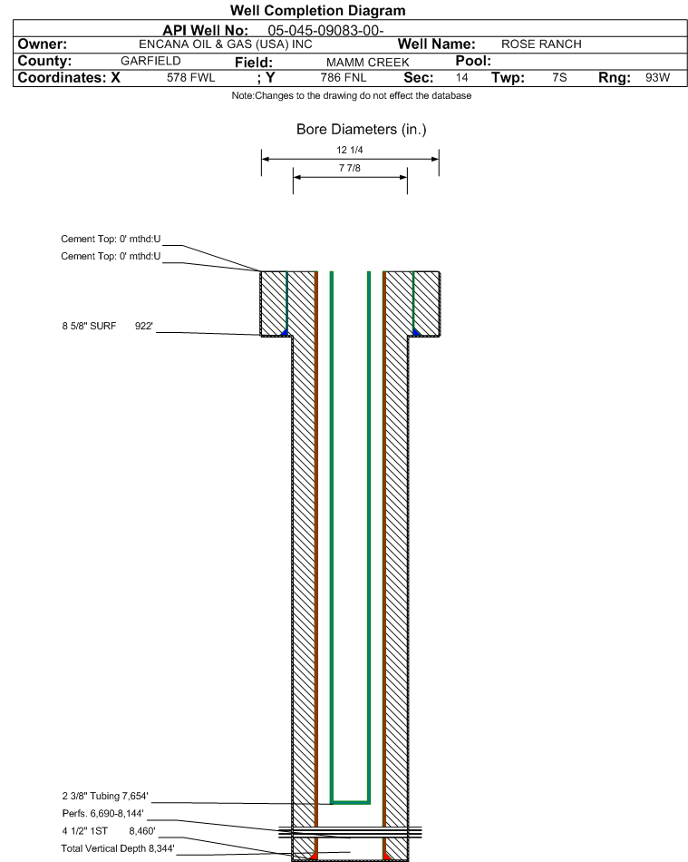 | Wellbore Completed | | Completion Date: | 8/20/2003 | | Spud Date: | 5/14/2003 | Spud Date Is: | ACTUAL | | Measured TD: | 8460 ft. | Measured PB depth: | 8372 ft. | | True Vertical TD: | 8344 ft. | True Vertical PB depth: | | | Top PZ Location: | Sec:14 Twp: | Footage: 1338 FNL 8 FWL | | Bottom Hole Location: | Sec:14 Twp: | Footage: 1340 FNL 10 FWL | | Log Types: | | | Casing: | String Type: SURF, Hole Size: 12.25 in., Size: 8.625 in., Top: 0 ft., Depth: 922 ft., Weight: 24 , Citings Type: ACTUAL | | Cement: | Sacks: 504, Top: 0 ft., Bottom: 922 ft., Determination Method: CALC | | Casing: | String Type: 1ST, Hole Size: 7.875 in., Size: 4.5 in., Top: 0 ft., Depth: 8460 ft., Weight: 11.6 , Citings Type: ACTUAL | | Cement: | Sacks: 1105, Top: 0 ft., Bottom: 8460 ft., Determination Method: CALC | | Formation | Interval Top | Log Bottom | Cored | DSTs | | WASATCH | 0 ft. | 5567 ft. | N | N | | WILLIAMS FORK | 5568 ft. | 8460 ft. | N | N |