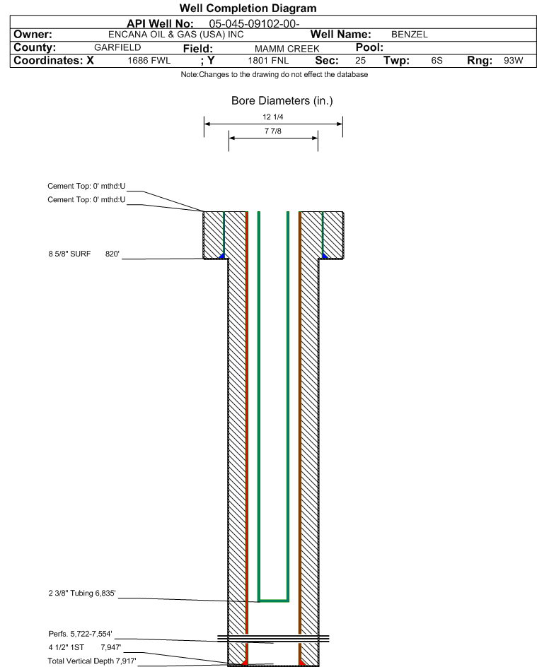 | Wellbore Completed | | Completion Date: | 10/10/2003 | | Spud Date: | 7/10/2003 | Spud Date Is: | ACTUAL | | Measured TD: | 7950 ft. | Measured PB depth: | 7892 ft. | | True Vertical TD: | 7917 ft. | True Vertical PB depth: | | | Top PZ Location: | Sec: Twp: | Footage: 1897 FNL 1977 FWL | | Bottom Hole Location: | Sec:25 Twp: | Footage: 1900 FNL 1980 FWL | | Log Types: | CBL / GR / CCL, RST / GR / CCL | | Casing: | String Type: SURF, Hole Size: 12.25 in., Size: 8.625 in., Top: 0 ft., Depth: 820 ft., Weight: 24 , Citings Type: ACTUAL | | Cement: | Sacks: 450, Top: 0 ft., Bottom: 830 ft., Determination Method: CALC | | Casing: | String Type: 1ST, Hole Size: 7.875 in., Size: 4.5 in., Top: 0 ft., Depth: 7947 ft., Weight: 11.6 , Citings Type: ACTUAL | | Cement: | Sacks: 1165, Top: 0 ft., Bottom: 7950 ft., Determination Method: CALC | | Formation | Interval Top | Log Bottom | Cored | DSTs | | WASATCH | | 4620 ft. | N | N | | WILLIAMS FORK | 4621 ft. | 7627 ft. | N | N | | ROLLINS | 7627 ft. | 7950 ft. | N | N |