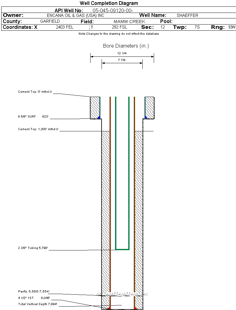 | Wellbore Completed | | Completion Date: | 5/22/2004 | | Spud Date: | 9/24/2003 | Spud Date Is: | ACTUAL | | Measured TD: | 8065 ft. | Measured PB depth: | 7754 ft. | | True Vertical TD: | 7894 ft. | True Vertical PB depth: | | | Top PZ Location: | Sec: Twp: | Footage: 1312 FSL 2606 FEL | | Bottom Hole Location: | Sec:12 Twp: | Footage: 1330 FSL 2633 FWL | | Log Types: | CBL, GR, PEX - AIT | | Casing: | String Type: SURF, Hole Size: 12.25 in., Size: 8.625 in., Top: 0 ft., Depth: 823 ft., Weight: 24 , Citings Type: ACTUAL | | Cement: | Sacks: 450, Top: 0 ft., Bottom: 823 ft., Determination Method: CALC | | Casing: | String Type: 1ST, Hole Size: 7.875 in., Size: 4.5 in., Top: 0 ft., Depth: 8045 ft., Weight: 11.6 , Citings Type: ACTUAL | | Cement: | Sacks: 1411, Top: 1300 ft., Bottom: 8065 ft., Determination Method: CBL | | Formation | Interval Top | Log Bottom | Cored | DSTs | | WASATCH G | 0 ft. | 4526 ft. | N | N | | WILLIAMS FORK | 4527 ft. | 7640 ft. | N | N | | ROLLINS | 7641 ft. | 8065 ft. | N | N |