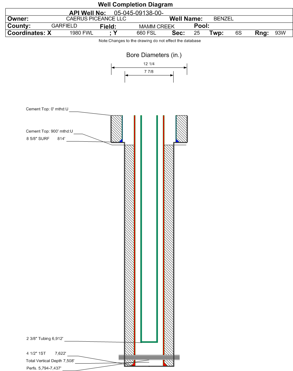 Formation WMFK Formation Classification: GW Status: AB - 7/8/2020 Interval Top: 5794 ft. Interval Bottom: 7437 ft.| Completed Information for Formation WILLIAMS FORK | | 1st Production Date: | N/A | Choke Size: | 0.375 in. | | Formation Name: | WILLIAMS FORK | Commingled: | No | | Production Method: | FLOWING | | Open Hole Completion: | No |