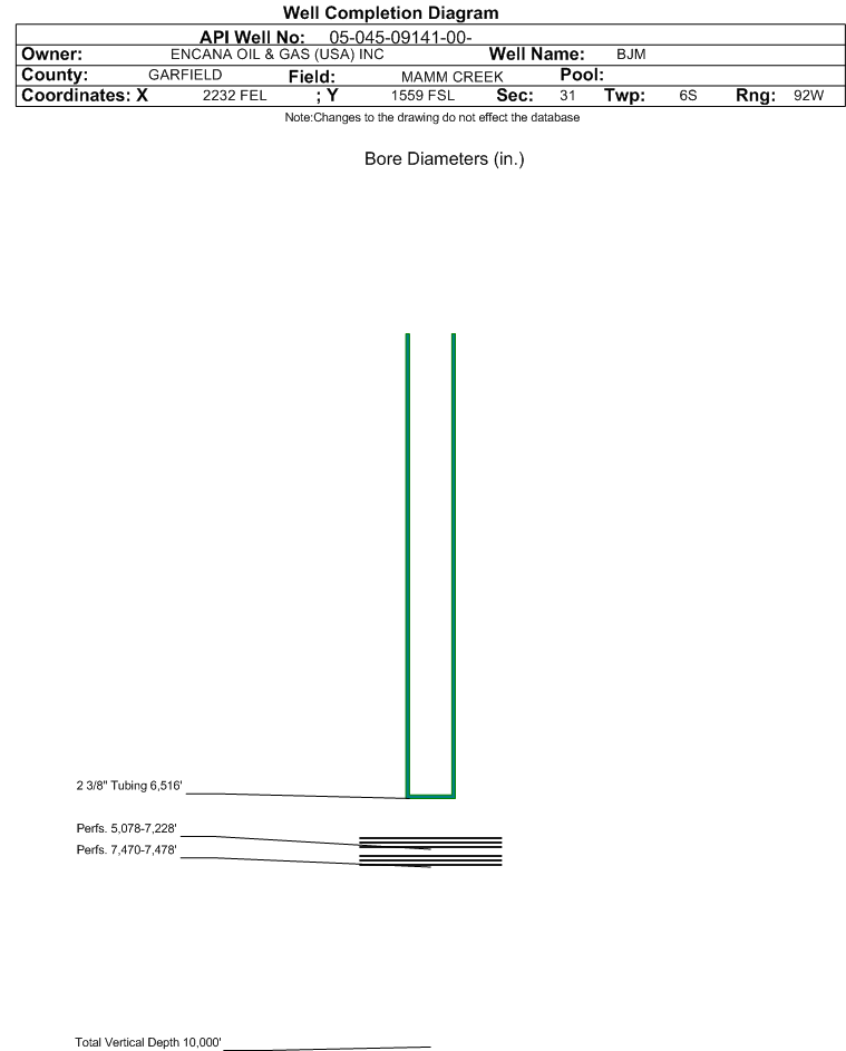 | | Perforation Data: | | Interval Top: | 5078 ft. | # Of Holes: | 100 | | Interval Bottom: | 7228 ft. | Hole Size: | 0.34 in. |