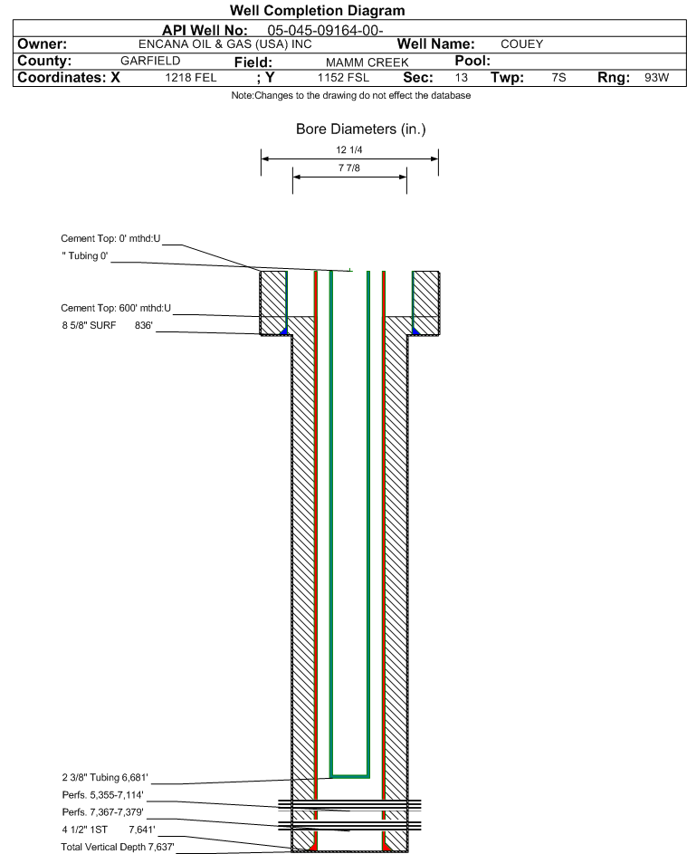 | Wellbore Completed | | Completion Date: | 12/21/2003 | | Spud Date: | 9/18/2003 | Spud Date Is: | ACTUAL | | Measured TD: | 7645 ft. | Measured PB depth: | 7598 ft. | | True Vertical TD: | 7637 ft. | True Vertical PB depth: | 7684 ft. | | Top PZ Location: | Sec:13 Twp: 7s 93w | Footage: 1325 FSL 1214 FEL | | Bottom Hole Location: | Sec:13 Twp: 7S 93W | Footage: 1434 FSL 1175 FEL | | Log Types: | CBL, PEX - AITH ( OPEN ) | | Log Types: | CBL, AI/GR | | Casing: | String Type: SURF, Hole Size: 12.25 in., Size: 8.625 in., Top: 0 ft., Depth: 836 ft., Weight: , Citings Type: ACTUAL | | Cement: | Sacks: 450, Top: 0 ft., Bottom: 836 ft., Determination Method: CALC | | Casing: | String Type: 1ST, Hole Size: 7.875 in., Size: 4.5 in., Top: 0 ft., Depth: 7641 ft., Weight: , Citings Type: ACTUAL | | Cement: | Sacks: 1450, Top: 600 ft., Bottom: 7645 ft., Determination Method: CBL | | Casing: | String Type: S.C. 1.1, Hole Size: , Size: 4.5 in., Top: , Depth: 1500 ft., Weight: , Citings Type: ACTUAL | | Cement: | Sacks: 100, Top: 1450 ft., Bottom: 1550 ft., Determination Method: CALC | | Formation | Interval Top | Log Bottom | Cored | DSTs | | WASATCH | 0 ft. | 4304 ft. | | | | WILLIAMS FORK | 4305 ft. | 7313 ft. | | | | ROLLINS | 7314 ft. | 7645 ft. | | |