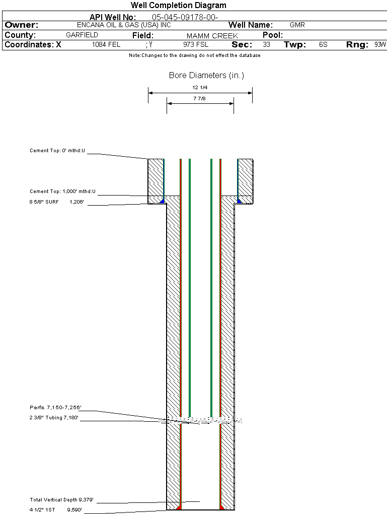 | Wellbore Completed | | Completion Date: | 10/28/2003 | | Spud Date: | 8/7/2003 | Spud Date Is: | ACTUAL | | Measured TD: | 9595 ft. | Measured PB depth: | 9492 ft. | | True Vertical TD: | 9379 ft. | True Vertical PB depth: | 0 ft. | | Top PZ Location: | Sec: Twp: | Footage: 1317 FSL 1328 FEL | | Bottom Hole Location: | Sec: Twp: | Footage: 1990 FSL 1990 FEL | | Log Types: | RSL, CBL | | Casing: | String Type: SURF, Hole Size: 12.25 in., Size: 8.625 in., Top: 0 ft., Depth: 1206 ft., Weight: 24 , Citings Type: ACTUAL | | Cement: | Sacks: 625, Top: 0 ft., Bottom: 1206 ft., Determination Method: CALC | | Casing: | String Type: 1ST, Hole Size: 7.875 in., Size: 4.5 in., Top: 0 ft., Depth: 9590 ft., Weight: 11.6 , Citings Type: ACTUAL | | Cement: | Sacks: 1466, Top: 1000 ft., Bottom: 9595 ft., Determination Method: CBL | | Formation | Interval Top | Log Bottom | Cored | DSTs | | WASATCH | 0 ft. | 6074 ft. | N | N | | WILLIAMS FORK | 6075 ft. | 9253 ft. | N | N | | ROLLINS | 9254 ft. | 9595 ft. | N | N |