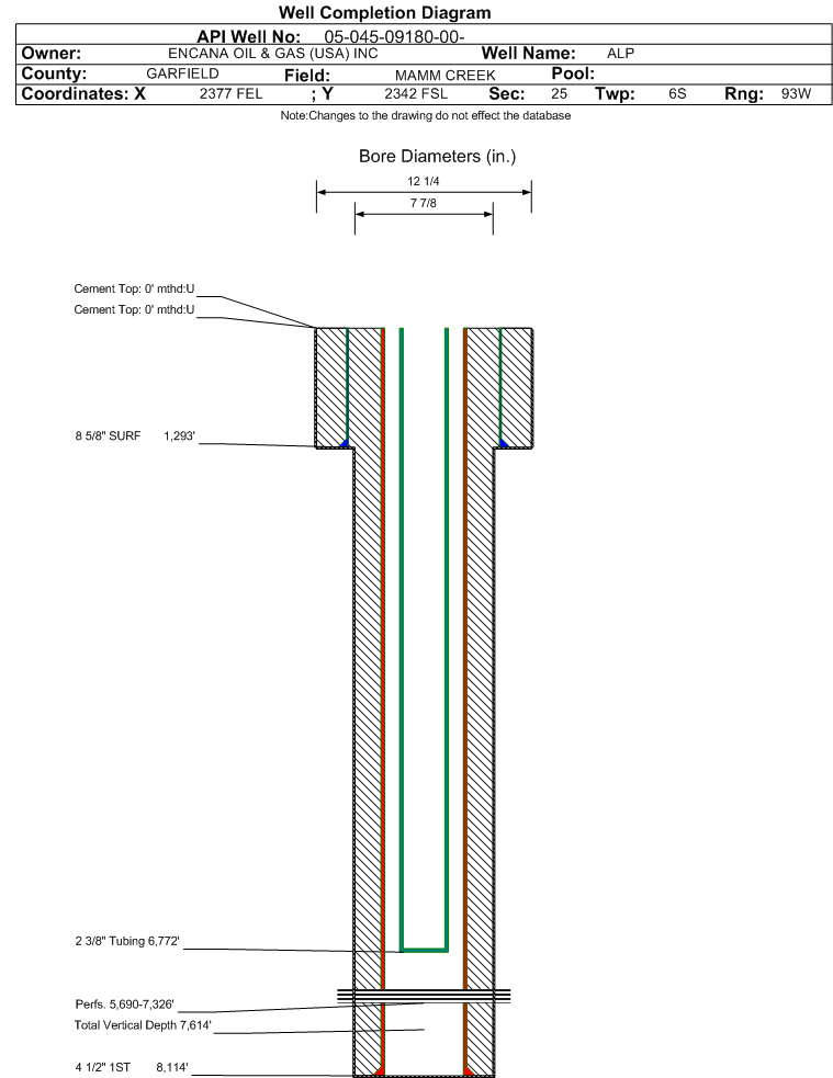 | | Perforation Data: | | Interval Top: | 5690 ft. | # Of Holes: | 108 | | Interval Bottom: | 7326 ft. | Hole Size: | |