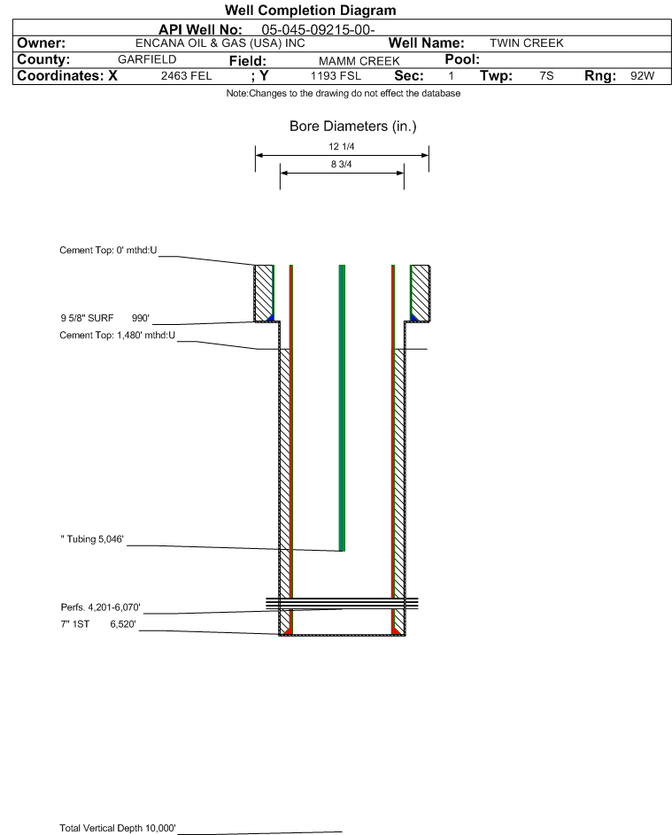 | | Tubing Size: | | Tubing Setting Depth: | 5046 ft. | | Tubing Packer Depth: | | Tubing Multiple Packer: | | | Open Hole Top: | | Open Hole Bottom: | | | Initial Test Data: | | Test Date: | N/A | Test Method: | | | Hours Tested: | | Gas Type: | | | Gas Disposal: | | |
