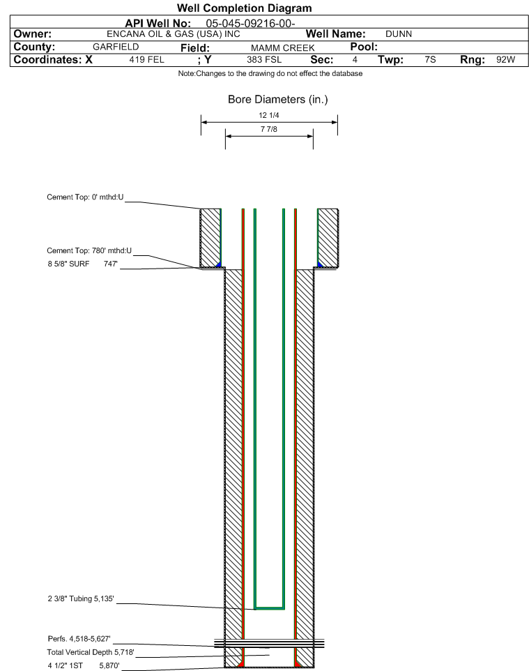 | Wellbore Completed | | Completion Date: | 11/3/2003 | | Spud Date: | 8/9/2003 | Spud Date Is: | ACTUAL | | Measured TD: | 5870 ft. | Measured PB depth: | 5770 ft. | | True Vertical TD: | 5718 ft. | True Vertical PB depth: | 0 ft. | | Top PZ Location: | Sec:4 Twp: | Footage: 665 FSL 1087 FEL | | Bottom Hole Location: | Sec:4 Twp: | Footage: 720 FSL 1175 FEL | | Log Types: | PEX, CB/GRCL/VDL | | Casing: | String Type: SURF, Hole Size: 12.25 in., Size: 8.625 in., Top: 0 ft., Depth: 747 ft., Weight: 24 , Citings Type: ACTUAL | | Cement: | Sacks: 400, Top: 0 ft., Bottom: 747 ft., Determination Method: CALC | | Casing: | String Type: 1ST, Hole Size: 7.875 in., Size: 4.5 in., Top: 0 ft., Depth: 5870 ft., Weight: 11.6 , Citings Type: ACTUAL | | Cement: | Sacks: 1225, Top: 780 ft., Bottom: 5870 ft., Determination Method: CBL | | Formation | Interval Top | Log Bottom | Cored | DSTs | | WASATCH | 0 ft. | 3160 ft. | N | N | | WILLIAMS FORK | 3161 ft. | 5870 ft. | N | N |