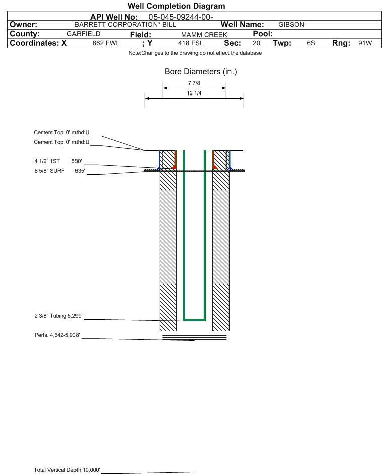 Wellbore #00 Wellbore Classification: GW Status: PR - 10/5/2005 Measured TD: 6141 ft.| Wellbore Data for Original Wellbore | Wellbore Classification: GW PR - 10/5/2005 | | Wellbore Permit | | | Permit #: | | Expiration Date: | 5/29/2004 | | Proposed Top PZ Location: | Sec:19 Twp: 6S 91W | Footage: 660 FSL 460 FEL | | Bottom Hole Location: | Sec:19 Twp: 6S 91W | Footage: 660 FSL 460 FEL | | Proposed Depth/Form: | 6668 ft. | | Surface Mineral Owner Same: | Yes | | Mineral Owner: | FEE | Surface Owner: | FEE | | Unit: | GIBSON GULCH | Unit Number: | | | Formation And Spacing: | Code: WMFK , Formation: WILLIAMS FORK , Order: , Unit Acreage: , Drill Unit: |