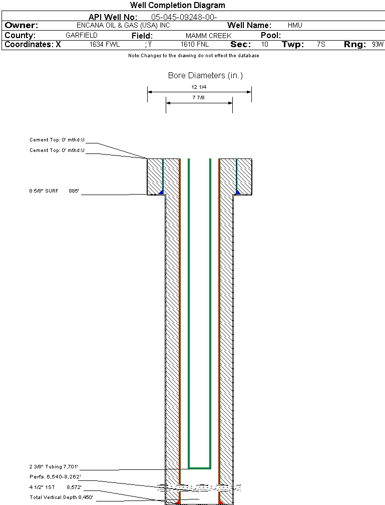 | Wellbore Completed | | Completion Date: | 4/19/2004 | | Spud Date: | 6/24/2003 | Spud Date Is: | ACTUAL | | Measured TD: | 8530 ft. | Measured PB depth: | 8451 ft. | | True Vertical TD: | 8450 ft. | True Vertical PB depth: | | | Top PZ Location: | Sec: Twp: | Footage: 2258 FNL 2394 FWL | | Bottom Hole Location: | Sec: Twp: | Footage: 2310 FNL 2465 FWL | | Log Types: | CBL,RST | | Casing: | String Type: SURF, Hole Size: 12.25 in., Size: 8.625 in., Top: 0 ft., Depth: 885 ft., Weight: 24 , Citings Type: ACTUAL | | Cement: | Sacks: 500, Top: 0 ft., Bottom: 885 ft., Determination Method: CALC | | Casing: | String Type: 1ST, Hole Size: 7.875 in., Size: 4.5 in., Top: 0 ft., Depth: 8572 ft., Weight: 11.6 , Citings Type: ACTUAL | | Cement: | Sacks: 1310, Top: 0 ft., Bottom: 8572 ft., Determination Method: CALC | | Formation | Interval Top | Log Bottom | Cored | DSTs | | WASATCH | 0 ft. | 5369 ft. | N | N | | WILLIAMS FORK | 5370 ft. | 8580 ft. | N | N |
