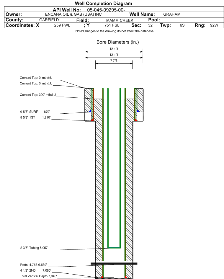 | Wellbore Completed | | Completion Date: | 10/29/2003 | | Spud Date: | 8/23/2003 | Spud Date Is: | ACTUAL | | Measured TD: | 7145 ft. | Measured PB depth: | 6833 ft. | | True Vertical TD: | 7040 ft. | True Vertical PB depth: | 0 ft. | | Top PZ Location: | Sec: Twp: | Footage: 1348 FSL 492 FWL | | Bottom Hole Location: | Sec:32 Twp: | Footage: 1350 FSL 500 FWL | | Log Types: | CBL-GR-CCL-VDL, RST-GR-CCL | | Casing: | String Type: SURF, Hole Size: 12.25 in., Size: 9.625 in., Top: 0 ft., Depth: 879 ft., Weight: 43.5 , Citings Type: ACTUAL | | Cement: | Sacks: , Top: 0 ft., Bottom: 879 ft., Determination Method: CALC | | Casing: | String Type: 1ST, Hole Size: 12.25 in., Size: 8.625 in., Top: 0 ft., Depth: 1210 ft., Weight: 32 , Citings Type: ACTUAL | | Cement: | Sacks: 625, Top: 0 ft., Bottom: 1210 ft., Determination Method: CALC | | Casing: | String Type: 2ND, Hole Size: 7.875 in., Size: 4.5 in., Top: 0 ft., Depth: 7080 ft., Weight: 11.6 , Citings Type: ACTUAL | | Cement: | Sacks: 1060, Top: 390 ft., Bottom: 7080 ft., Determination Method: CBL | | Formation | Interval Top | Log Bottom | Cored | DSTs | | WASATCH | 0 ft. | 3670 ft. | N | N | | WILLIAMS FORK | 3671 ft. | 6835 ft. | N | N | | ROLLINS | 6836 ft. | 7145 ft. | N | N |