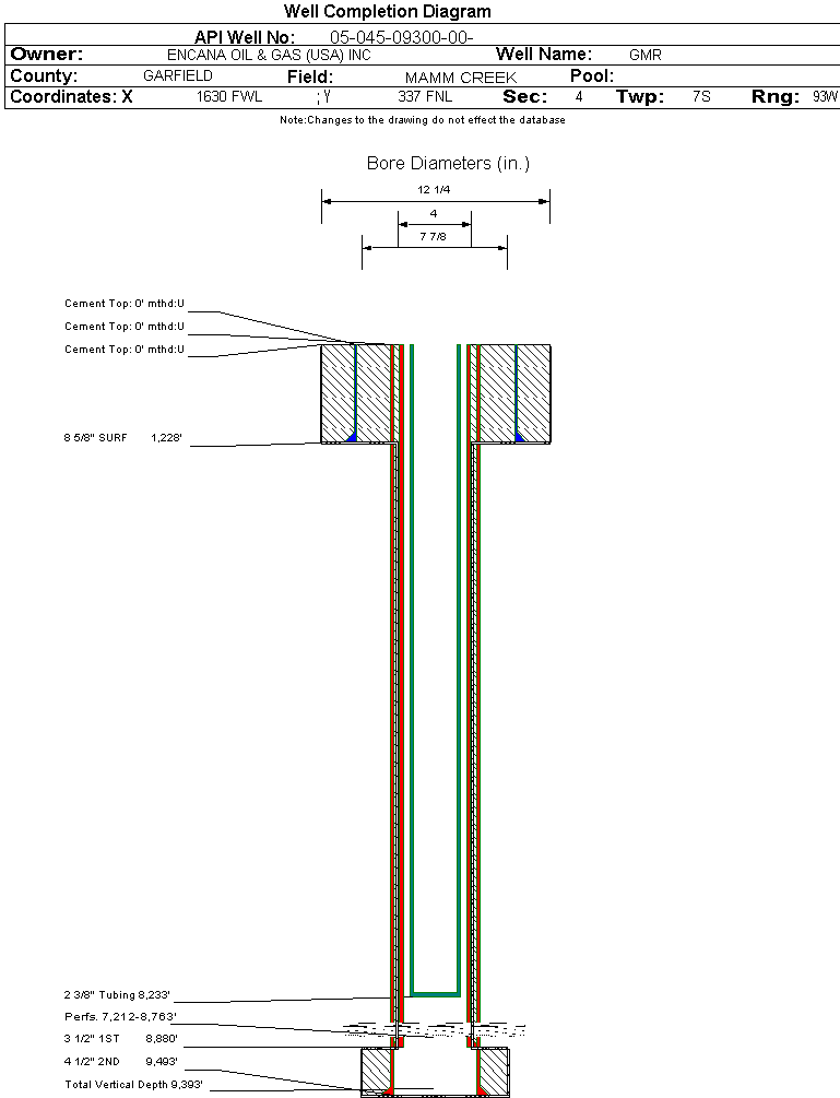 | Wellbore Completed | | Completion Date: | 7/20/2004 | | Spud Date: | 8/2/2003 | Spud Date Is: | ACTUAL | | Measured TD: | 9500 ft. | Measured PB depth: | 8852 ft. | | True Vertical TD: | 9393 ft. | True Vertical PB depth: | 0 ft. | | Top PZ Location: | Sec:33 Twp: | Footage: 559 FSL 1925 FWL | | Bottom Hole Location: | Sec:33 Twp: | Footage: 650 FSL 1970 FWL | | Log Types: | CBL, MULTIFINGER CAL, PEX-AITH | | Casing: | String Type: SURF, Hole Size: 12.25 in., Size: 8.625 in., Top: 0 ft., Depth: 1228 ft., Weight: 24 , Citings Type: ACTUAL | | Cement: | Sacks: 625, Top: 0 ft., Bottom: 1235 ft., Determination Method: CALC | | Casing: | String Type: 1ST, Hole Size: 7.875 in., Size: 4.5 in., Top: 0 ft., Depth: 8880 ft., Weight: 11.6 , Citings Type: ACTUAL | | Cement: | Sacks: 1475, Top: 0 ft., Bottom: 8880 ft., Determination Method: CALC | | Casing: | String Type: 2ND, Hole Size: 4 in., Size: 3.5 in., Top: 0 ft., Depth: 9493 ft., Weight: 8.8 , Citings Type: ACTUAL | | Cement: | Sacks: 120, Top: , Bottom: 9500 ft., Determination Method: CALC | | Formation | Interval Top | Log Bottom | Cored | DSTs | | WASATCH | 0 ft. | 6135 ft. | N | N | | WILLIAMS FORK | 6136 ft. | 9202 ft. | N | N | | ROLLINS | 9203 ft. | 9500 ft. | N | N |