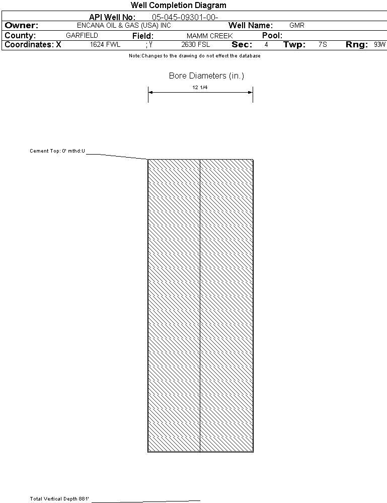 | Wellbore Completed | | Completion Date: | 8/30/2003 | | Spud Date: | 8/22/2003 | Spud Date Is: | ACTUAL | | Measured TD: | 881 ft. | Measured PB depth: | | | True Vertical TD: | | True Vertical PB depth: | | | Bottom Hole Location: | Sec:4 Twp: | Footage: 2350 FSL 1340 FWL | | Log Types: | | | Casing: | String Type: SURF, Hole Size: 12.25 in., Size: 8.625 in., Top: , Depth: 753 ft., Weight: , Citings Type: ACTUAL | | Cement: | Sacks: 629, Top: , Bottom: 753 ft., Determination Method: CALC | | Formation | Interval Top | Log Bottom | Cored | DSTs | | WASATCH | | 881 ft. | N | N | | No formation data to display. |