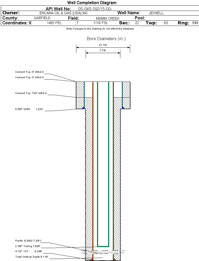 | Wellbore Completed | | Completion Date: | 5/27/2004 | | Spud Date: | 11/17/2003 | Spud Date Is: | ACTUAL | | Measured TD: | 8246 ft. | Measured PB depth: | 8183 ft. | | True Vertical TD: | 8119 ft. | True Vertical PB depth: | 0 ft. | | Top PZ Location: | Sec: Twp: | Footage: 1983 FSL 1987 FEL | | Bottom Hole Location: | Sec:22 Twp: | Footage: 1990 FSL 1990 FEL | | Log Types: | RST/GR/CCL, CBL/GR/CCL | | Casing: | String Type: CONDUCTOR, Hole Size: , Size: , Top: , Depth: , Weight: , Citings Type: ACTUAL | | Cement: | Sacks: , Top: , Bottom: , Determination Method: CALC | | Casing: | String Type: SURF, Hole Size: 12.25 in., Size: 8.625 in., Top: 0 ft., Depth: 1232 ft., Weight: 24 , Citings Type: ACTUAL | | Cement: | Sacks: 645, Top: 0 ft., Bottom: 1231 ft., Determination Method: CALC | | Casing: | String Type: 1ST, Hole Size: 7.875 in., Size: 4.5 in., Top: 0 ft., Depth: 8246 ft., Weight: 11.6 , Citings Type: ACTUAL | | Cement: | Sacks: 1215, Top: 720 ft., Bottom: 8246 ft., Determination Method: CBL | | Formation | Interval Top | Log Bottom | Cored | DSTs | | WASATCH | 0 ft. | 5699 ft. | N | N | | WILLIAMS FORK | 5700 ft. | 8246 ft. | N | N |