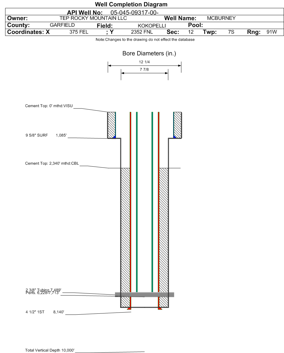 Formation WMFK Formation Classification: GW Status: AB - 5/1/2020 Interval Top: 6228 ft. Interval Bottom: 7713 ft.| Completed Information for Formation WILLIAMS FORK | | 1st Production Date: | N/A | Choke Size: | 0.219 in. | | Formation Name: | WILLIAMS FORK | Commingled: | No | | Production Method: | FLOWING | | Open Hole Completion: | No |