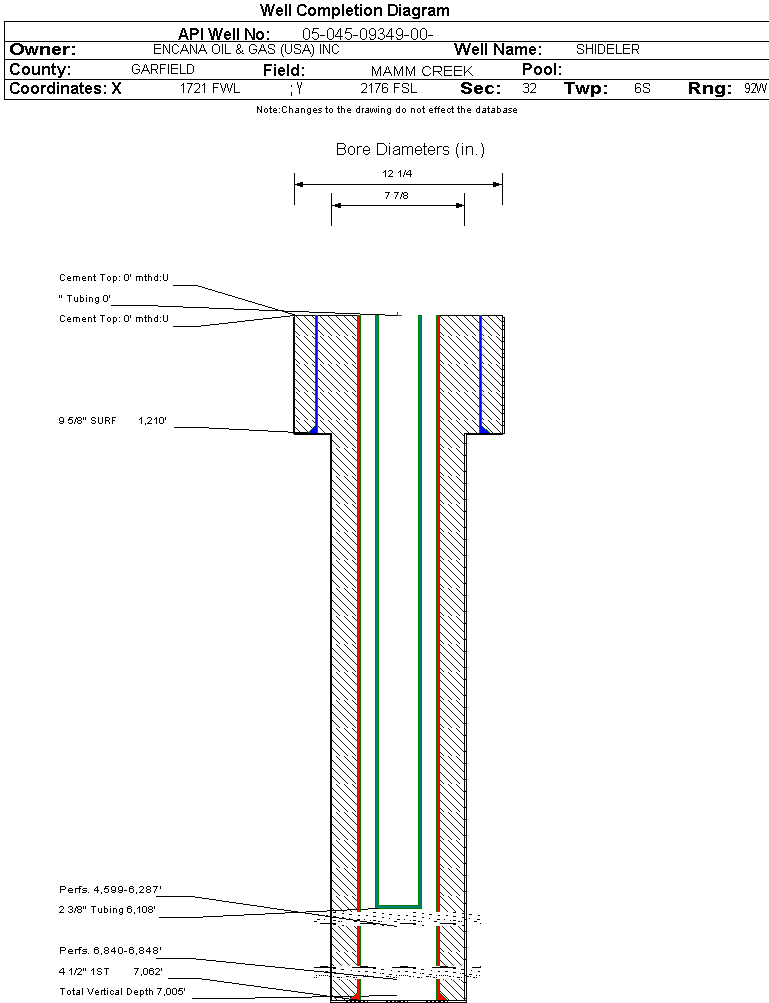 | Wellbore Completed | | Completion Date: | 2/12/2004 | | Spud Date: | 10/16/2003 | Spud Date Is: | ACTUAL | | Measured TD: | 7065 ft. | Measured PB depth: | 6998 ft. | | True Vertical TD: | 7005 ft. | True Vertical PB depth: | | | Top PZ Location: | Sec: Twp: | Footage: 2630 FNL 1960 FWL | | Bottom Hole Location: | Sec:32 Twp: | Footage: 2630 FNL 1960 FWL | | Log Types: | CBL, PEX | | Casing: | String Type: SURF, Hole Size: 12.25 in., Size: 9.625 in., Top: 0 ft., Depth: 1210 ft., Weight: 40 , Citings Type: ACTUAL | | Cement: | Sacks: 465, Top: 0 ft., Bottom: 1210 ft., Determination Method: CALC | | Casing: | String Type: 1ST, Hole Size: 7.875 in., Size: 4.5 in., Top: 0 ft., Depth: 7062 ft., Weight: 11.6 , Citings Type: ACTUAL | | Cement: | Sacks: 1360, Top: 0 ft., Bottom: 7065 ft., Determination Method: CBL | | Formation | Interval Top | Log Bottom | Cored | DSTs | | WASATCH | 0 ft. | 3666 ft. | N | N | | WILLIAMS FORK | 3667 ft. | 6791 ft. | N | N | | ROLLINS | 6792 ft. | 7065 ft. | N | N |