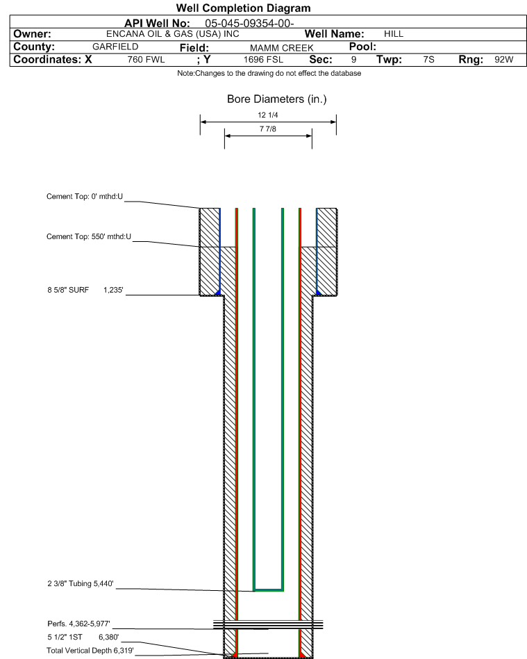 | Wellbore Completed | | Completion Date: | 12/4/2004 | | Spud Date: | 7/16/2004 | Spud Date Is: | ACTUAL | | Measured TD: | 6386 ft. | Measured PB depth: | 6290 ft. | | True Vertical TD: | 6319 ft. | True Vertical PB depth: | | | Top PZ Location: | Sec: Twp: | Footage: 2758 FNL 1235 FWL | | Bottom Hole Location: | Sec:9 Twp: 7S 92W | Footage: 2130 FSL 670 FWL | | Log Types: | PEX, CBL | | Casing: | String Type: CONDUCTOR, Hole Size: , Size: , Top: 0 ft., Depth: 40 ft., Weight: UNK , Citings Type: ACTUAL | | Cement: | Sacks: 94, Top: 0 ft., Bottom: 40 ft., Determination Method: CALC | | Casing: | String Type: SURF, Hole Size: 12.25 in., Size: 8.625 in., Top: 0 ft., Depth: 1235 ft., Weight: 24# , Citings Type: ACTUAL | | Cement: | Sacks: 640, Top: 0 ft., Bottom: 1235 ft., Determination Method: CALC | | Casing: | String Type: 1ST, Hole Size: 7.875 in., Size: 5.5 in., Top: 0 ft., Depth: 6380 ft., Weight: 17# , Citings Type: ACTUAL | | Cement: | Sacks: 1475, Top: 350 ft., Bottom: 6380 ft., Determination Method: CBL | | Formation | Interval Top | Log Bottom | Cored | DSTs | | WASATCH | 0 ft. | 3066 ft. | N | N | | WILLIAMS FORK | 3067 ft. | 6223 ft. | N | N | | ROLLINS | 6224 ft. | 6386 ft. | N | N |