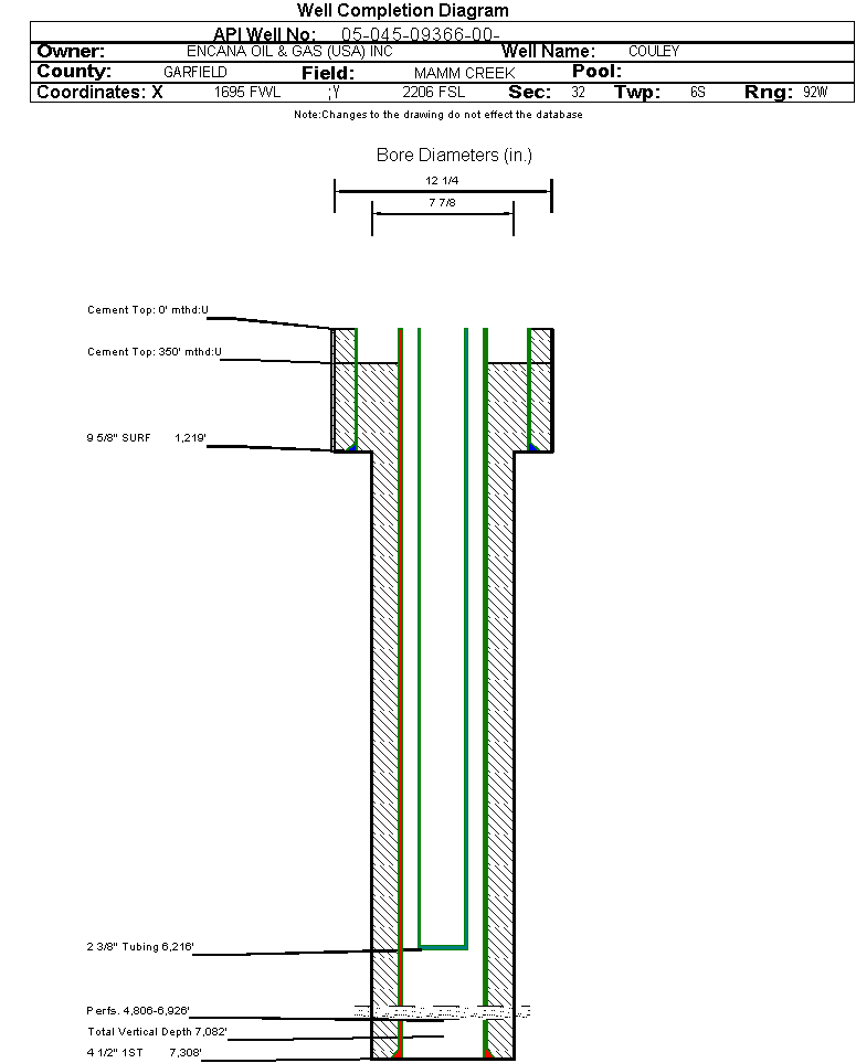 | Wellbore Completed | | Completion Date: | 2/17/2004 | | Spud Date: | 11/23/2003 | Spud Date Is: | ACTUAL | | Measured TD: | 7310 ft. | Measured PB depth: | 7224 ft. | | True Vertical TD: | 7082 ft. | True Vertical PB depth: | | | Top PZ Location: | Sec: Twp: | Footage: 1976 FNL 1312 FWL | | Bottom Hole Location: | Sec:32 Twp: | Footage: 1976 FNL 1312 FWL | | Log Types: | CBL, PEX | | Casing: | String Type: SURF, Hole Size: 12.25 in., Size: 9.625 in., Top: 0 ft., Depth: 1219 ft., Weight: 36 , Citings Type: ACTUAL | | Cement: | Sacks: 485, Top: 0 ft., Bottom: 1219 ft., Determination Method: CALC | | Casing: | String Type: 1ST, Hole Size: 7.875 in., Size: 4.5 in., Top: 0 ft., Depth: 7308 ft., Weight: 11.6 , Citings Type: ACTUAL | | Cement: | Sacks: 1490, Top: 350 ft., Bottom: 7310 ft., Determination Method: CBL | | Formation | Interval Top | Log Bottom | Cored | DSTs | | WASATCH | 0 ft. | 3813 ft. | N | N | | WILLIAMS FORK | 3814 ft. | 7015 ft. | N | N | | ROLLINS | 7016 ft. | 7310 ft. | N | N |