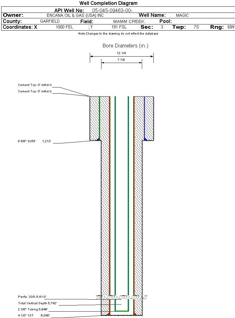 | Wellbore Completed | | Completion Date: | 12/28/2004 | | Spud Date: | 3/3/2004 | Spud Date Is: | ACTUAL | | Measured TD: | 6010 ft. | Measured PB depth: | 5990 ft. | | True Vertical TD: | 5742 ft. | True Vertical PB depth: | 5723 ft. | | Top PZ Location: | Sec: Twp: | Footage: 623 FNL 1980 FEL | | Bottom Hole Location: | Sec:10 Twp: 7S 92W | Footage: 879 FNL 1991 FEL | | Log Types: | GR-PEX,GR-CCL-CBLCGR-CCL-RST-TEMP | | Casing: | String Type: SURF, Hole Size: 12.25 in., Size: 8.625 in., Top: 0 ft., Depth: 1212 ft., Weight: 24 , Citings Type: ACTUAL | | Cement: | Sacks: 625, Top: 0 ft., Bottom: 1222 ft., Determination Method: CALC | | Casing: | String Type: 1ST, Hole Size: 7.875 in., Size: 4.5 in., Top: 0 ft., Depth: 6040 ft., Weight: 11.6 , Citings Type: ACTUAL | | Cement: | Sacks: 1691, Top: 1170 ft., Bottom: 6040 ft., Determination Method: CBL | | Casing: | String Type: S.C. 1.1, Hole Size: , Size: 4.5 in., Top: , Depth: 841 ft., Weight: , Citings Type: ACTUAL | | Cement: | Sacks: 200, Top: 367 ft., Bottom: 841 ft., Determination Method: CALC | | Casing: | String Type: S.C. 1.2, Hole Size: , Size: 4.5 in., Top: , Depth: 305 ft., Weight: , Citings Type: ACTUAL | | Cement: | Sacks: 90, Top: 0 ft., Bottom: 305 ft., Determination Method: CALC | | Casing: | String Type: 2ND, Hole Size: , Size: 3.5 in., Top: 0 ft., Depth: 5946 ft., Weight: , Citings Type: ACTUAL | | Cement: | Sacks: 83, Top: 0 ft., Bottom: 5946 ft., Determination Method: CALC | | Formation | Interval Top | Log Bottom | Cored | DSTs | | WASATCH | 0 ft. | 3113 ft. | N | N | | WILLIAMS FORK | 3114 ft. | 6010 ft. | N | N |