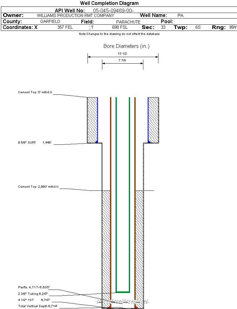 Wellbore #00 Wellbore Classification: GW Status: PR - 7/11/2004 Measured TD: 6765 ft. Vertical TD: 6714 ft.| Wellbore Data for Original Wellbore | Wellbore Classification: GW PR - 7/11/2004 | | Wellbore Permit | DIRECTIONAL | | Permit #: | 20032115 | Expiration Date: | 11/18/2004 | | Proposed Top PZ Location: | Sec: Twp: | Footage: 219 FSL 638 FEL | | Bottom Hole Location: | Sec: Twp: | Footage: 212 FSL 644 FEL | | Proposed Depth/Form: | 6785 ft. | | Surface Mineral Owner Same: | Yes | | Mineral Owner: | FEE | Surface Owner: | FEE | | Unit: | | Unit Number: | | | Formation And Spacing: | Code: WMFK , Formation: WILLIAMS FORK , Order: 139-38 , Unit Acreage: 160, Drill Unit: SE/4 |