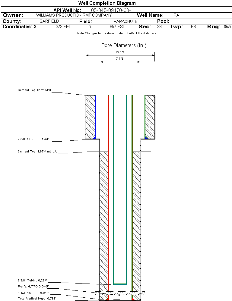 Wellbore #00 Wellbore Classification: GW Status: PR - 7/13/2004 Measured TD: 6830 ft. Vertical TD: 6788 ft.| Wellbore Data for Original Wellbore | Wellbore Classification: GW PR - 7/13/2004 | | Wellbore Permit | DIRECTIONAL | | Permit #: | 20032116 | Expiration Date: | 11/18/2004 | | Proposed Top PZ Location: | Sec: Twp: | Footage: 1177 FSL 619 FEL | | Bottom Hole Location: | Sec: Twp: | Footage: 1170 FSL 613 FEL | | Proposed Depth/Form: | 6850 ft. | | Surface Mineral Owner Same: | Yes | | Mineral Owner: | FEE | Surface Owner: | FEE | | Unit: | | Unit Number: | | | Formation And Spacing: | Code: WMFK , Formation: WILLIAMS FORK , Order: 139-38 , Unit Acreage: 160, Drill Unit: SE/4 |