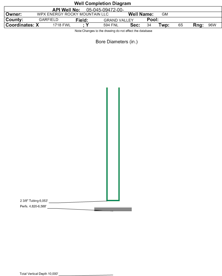 Formation WFCM Formation Classification: OW Status: PR - 4/7/2004 Interval Top: 4820 ft. Interval Bottom: 6588 ft.| Completed Information for Formation WILLIAMS FORK - CAMEO | | 1st Production Date: | N/A | Choke Size: | 0.203 in. | | Formation Name: | WILLIAMS FORK - CAMEO | Commingled: | No | | Production Method: | FLOWING | | Open Hole Completion: | No |