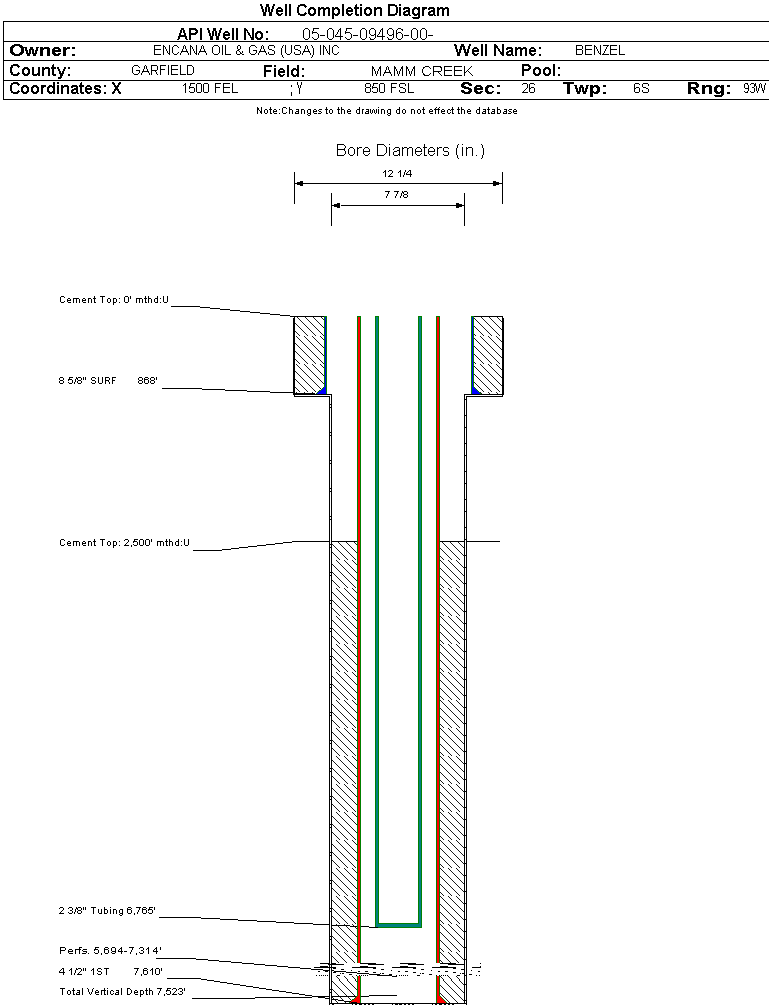 | Wellbore Completed | | Completion Date: | 6/11/2004 | | Spud Date: | 2/11/2004 | Spud Date Is: | ACTUAL | | Measured TD: | 7610 ft. | Measured PB depth: | 7565 ft. | | True Vertical TD: | 7523 ft. | True Vertical PB depth: | 0 ft. | | Top PZ Location: | Sec:26 Twp: | Footage: 670 FSL 1320 FEL | | Bottom Hole Location: | Sec:26 Twp: | Footage: 670 FSL 1330 FEL | | Log Types: | CBL, RST | | Casing: | String Type: SURF, Hole Size: 12.25 in., Size: 8.625 in., Top: 0 ft., Depth: 868 ft., Weight: 24 , Citings Type: ACTUAL | | Cement: | Sacks: 450, Top: 0 ft., Bottom: 868 ft., Determination Method: CALC | | Casing: | String Type: 1ST, Hole Size: 7.875 in., Size: 4.5 in., Top: 0 ft., Depth: 7610 ft., Weight: 11.6 , Citings Type: ACTUAL | | Cement: | Sacks: 1095, Top: 2500 ft., Bottom: 7610 ft., Determination Method: CBL | | Formation | Interval Top | Log Bottom | Cored | DSTs | | WASATCH | 0 ft. | 4679 ft. | N | N | | WILLIAMS FORK | 4680 ft. | 7610 ft. | N | N |