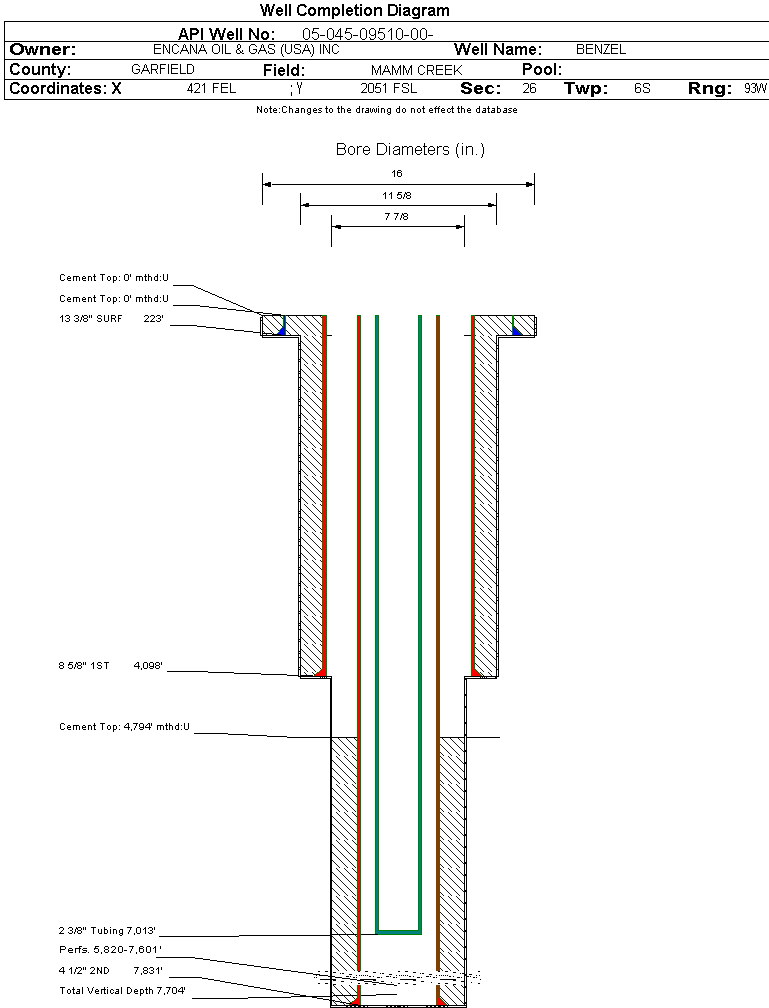 | Wellbore Completed | | Completion Date: | 2/24/2004 | | Spud Date: | 2/8/2004 | Spud Date Is: | ACTUAL | | Measured TD: | 7835 ft. | Measured PB depth: | 7810 ft. | | True Vertical TD: | 7704 ft. | True Vertical PB depth: | 7679 ft. | | Top PZ Location: | Sec:25 Twp: 6S 93W | Footage: 2558 FSL 382 FWL | | Bottom Hole Location: | Sec:25 Twp: 6S 93W | Footage: 2540 FSL 417 FWL | | Log Types: | RST/GR, CBL/GR | | Log Types: | | | Casing: | String Type: CONDUCTOR, Hole Size: 13.375 in., Size: 12.75 in., Top: 0 ft., Depth: 223 ft., Weight: 48 , Citings Type: ACTUAL | | Cement: | Sacks: 200, Top: 0 ft., Bottom: 223 ft., Determination Method: VISU | | Casing: | String Type: SURF, Hole Size: 8.625 in., Size: 7.875 in., Top: 0 ft., Depth: 4098 ft., Weight: 32 , Citings Type: ACTUAL | | Cement: | Sacks: 1000, Top: 0 ft., Bottom: 4098 ft., Determination Method: VISU | | Casing: | String Type: 1ST, Hole Size: 4.5 in., Size: 4 in., Top: 0 ft., Depth: 7831 ft., Weight: 11.6 , Citings Type: ACTUAL | | Cement: | Sacks: 845, Top: 4854 ft., Bottom: 7835 ft., Determination Method: CBL | | Formation | Interval Top | Log Bottom | Cored | DSTs | | WASATCH | 0 ft. | 4711 ft. | N | N | | WILLIAMS FORK | 4712 ft. | 7690 ft. | N | N | | ROLLINS | 7691 ft. | 7835 ft. | N | N |