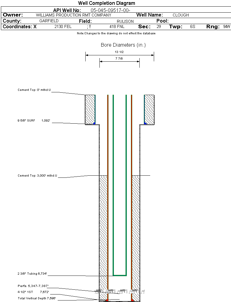 Wellbore #00 Wellbore Classification: GW Status: PR - 6/6/2004 Measured TD: 7680 ft. Vertical TD: 7596 ft.| Wellbore Data for Original Wellbore | Wellbore Classification: GW PR - 6/6/2004 | | Wellbore Permit | DIRECTIONAL | | Permit #: | 20032276 | Expiration Date: | 12/3/2004 | | Proposed Top PZ Location: | Sec: Twp: | Footage: 1065 FNL 2173 FEL | | Bottom Hole Location: | Sec: Twp: | Footage: 1065 FNL 2175 FEL | | Proposed Depth/Form: | 7660 ft. | | Surface Mineral Owner Same: | Yes | | Mineral Owner: | FEE | Surface Owner: | FEE | | Unit: | | Unit Number: | | | Formation And Spacing: | Code: WMFK , Formation: WILLIAMS FORK , Order: 139-38 , Unit Acreage: 320, Drill Unit: N/2 |