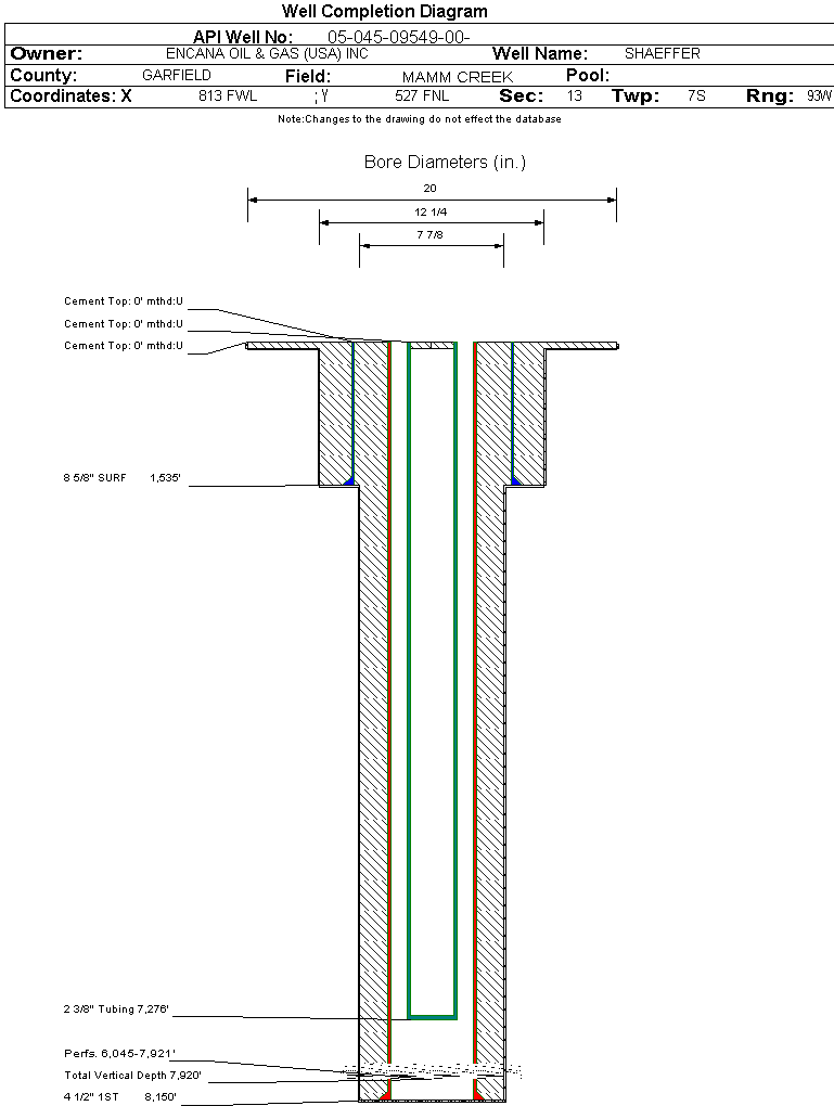 | Wellbore Completed | | Completion Date: | 2/14/2005 | | Spud Date: | 10/22/2004 | Spud Date Is: | ACTUAL | | Measured TD: | 8164 ft. | Measured PB depth: | 8108 ft. | | True Vertical TD: | 7920 ft. | True Vertical PB depth: | 0 ft. | | Top PZ Location: | Sec:12 Twp: | Footage: 10 FSL 650 FWL | | Bottom Hole Location: | Sec:13 Twp: 7S 93W | Footage: 660 FSL 10 FWL | | Log Types: | RST/GR, CBL/GR/TEMP | | Casing: | String Type: CONDUCTOR, Hole Size: 20 in., Size: 16 in., Top: 0 ft., Depth: 60 ft., Weight: 42 , Citings Type: ACTUAL | | Cement: | Sacks: 6, Top: 0 ft., Bottom: 60 ft., Determination Method: CALC | | Casing: | String Type: SURF, Hole Size: 12.25 in., Size: 8.625 in., Top: 0 ft., Depth: 1535 ft., Weight: 24 , Citings Type: ACTUAL | | Cement: | Sacks: 975, Top: 0 ft., Bottom: 1535 ft., Determination Method: CALC | | Casing: | String Type: 1ST, Hole Size: 7.875 in., Size: 4.5 in., Top: 0 ft., Depth: 8150 ft., Weight: 11.6 , Citings Type: ACTUAL | | Cement: | Sacks: 1470, Top: 0 ft., Bottom: 8150 ft., Determination Method: CALC | | Formation | Interval Top | Log Bottom | Cored | DSTs | | WASATCH | 0 ft. | 4957 ft. | N | N | | WILLIAMS FORK | 4958 ft. | 8024 ft. | N | N | | ROLLINS | 8025 ft. | 8164 ft. | N | N |