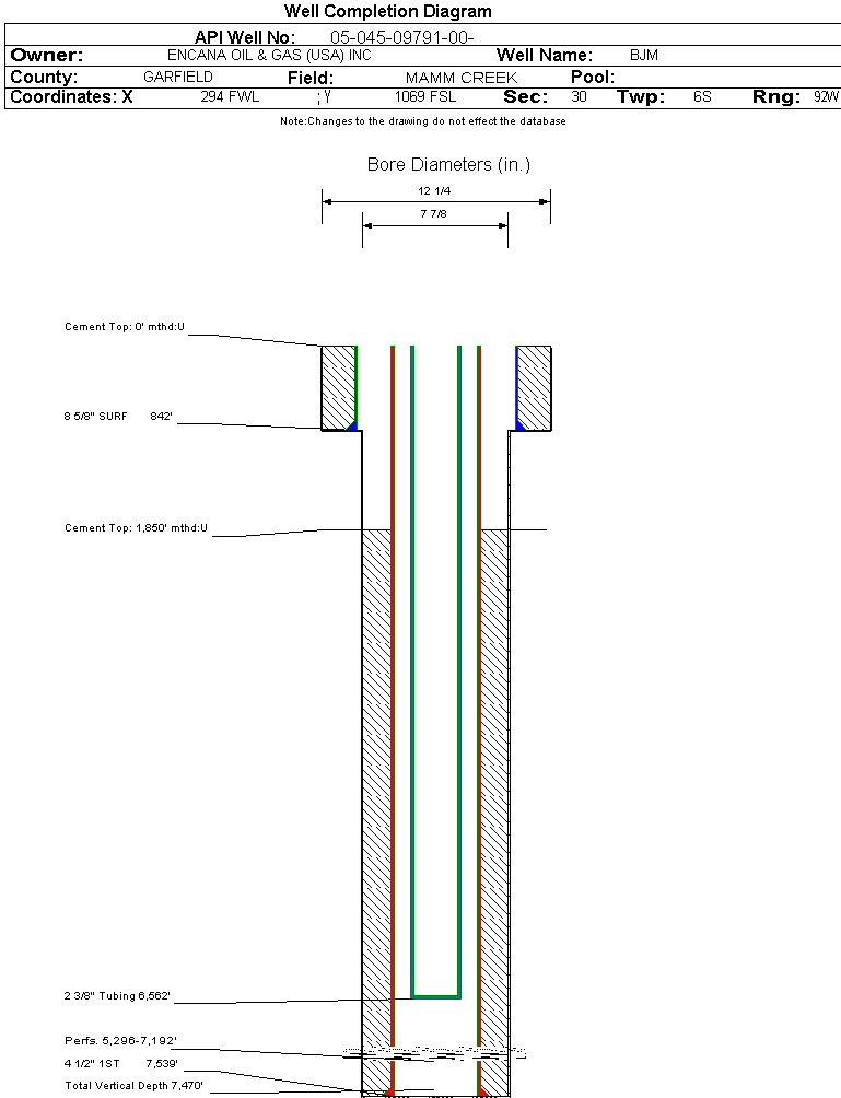 | Wellbore Completed | | Completion Date: | 4/16/2004 | | Spud Date: | 2/4/2004 | Spud Date Is: | ACTUAL | | Measured TD: | 7551 ft. | Measured PB depth: | 6562 ft. | | True Vertical TD: | 7470 ft. | True Vertical PB depth: | | | Top PZ Location: | Sec:30 Twp: | Footage: 652 FSL 944 FWL | | Bottom Hole Location: | Sec:30 Twp: | Footage: 652 FSL 944 FWL | | Log Types: | CBL, PEX | | Casing: | String Type: SURF, Hole Size: 12.25 in., Size: 8.625 in., Top: 0 ft., Depth: 842 ft., Weight: 24 , Citings Type: ACTUAL | | Cement: | Sacks: 450, Top: 0 ft., Bottom: 842 ft., Determination Method: CALC | | Casing: | String Type: 1ST, Hole Size: 7.875 in., Size: 4.5 in., Top: 0 ft., Depth: 7539 ft., Weight: 11.6 , Citings Type: ACTUAL | | Cement: | Sacks: 1130, Top: 1850 ft., Bottom: 7539 ft., Determination Method: CBL | | Formation | Interval Top | Log Bottom | Cored | DSTs | | WASATCH | 0 ft. | 4110 ft. | N | N | | WILLIAMS FORK | 4111 ft. | 7263 ft. | N | N | | ROLLINS | 7264 ft. | 7551 ft. | N | N |
