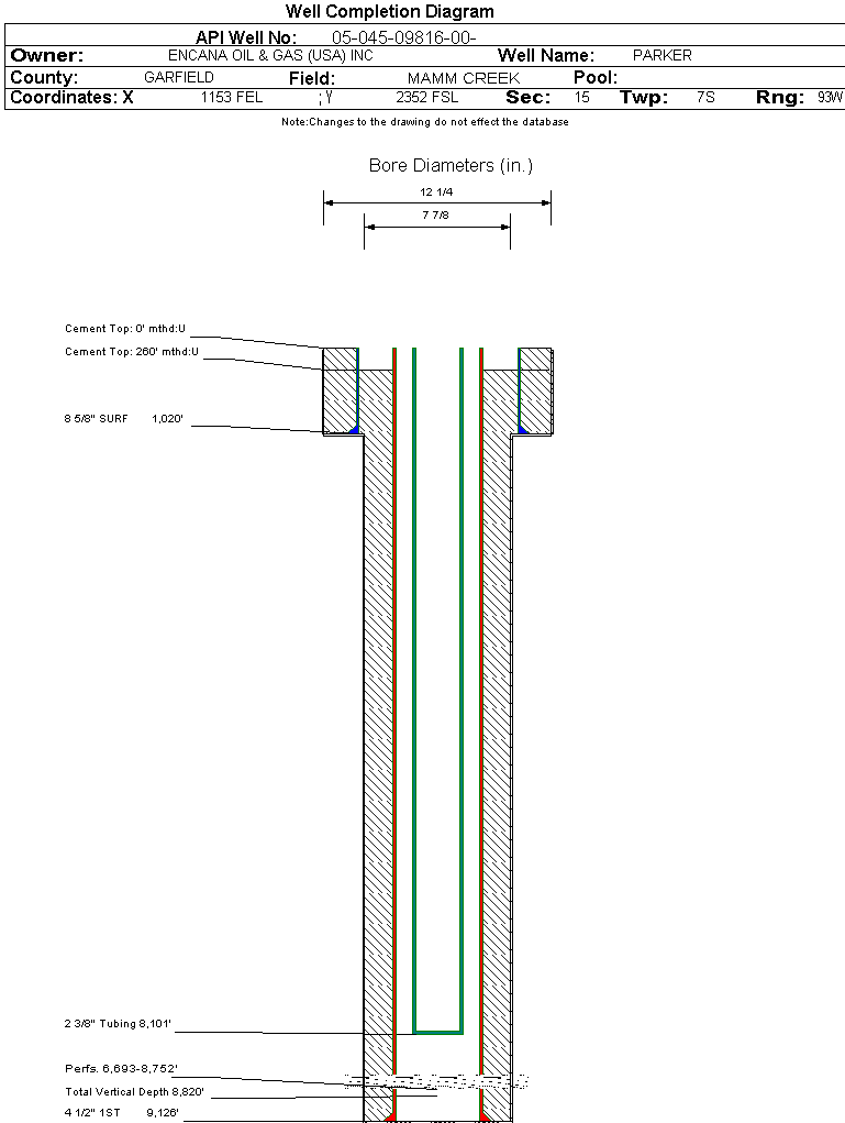 | Wellbore Completed | | Completion Date: | 7/10/2004 | | Spud Date: | 4/17/2004 | Spud Date Is: | ACTUAL | | Measured TD: | 9126 ft. | Measured PB depth: | 9050 ft. | | True Vertical TD: | 8820 ft. | True Vertical PB depth: | 8744 ft. | | Top PZ Location: | Sec:15 Twp: | Footage: 660 FSL 660 FEL | | Bottom Hole Location: | Sec:15 Twp: | Footage: 660 FSL 660 FEL | | Log Types: | GR-RST, GR-CBL, GR-TEMPERATURE LOG | | Casing: | String Type: SURF, Hole Size: 12.25 in., Size: 8.625 in., Top: 0 ft., Depth: 1020 ft., Weight: 24 , Citings Type: ACTUAL | | Cement: | Sacks: 435, Top: 0 ft., Bottom: 1020 ft., Determination Method: CBL | | Casing: | String Type: 1ST, Hole Size: 7.875 in., Size: 4.5 in., Top: 0 ft., Depth: 9126 ft., Weight: 11.6 , Citings Type: ACTUAL | | Cement: | Sacks: 1420, Top: 260 ft., Bottom: 9126 ft., Determination Method: CALC | | Formation | Interval Top | Log Bottom | Cored | DSTs | | WASATCH | 0 ft. | 5865 ft. | N | N | | WILLIAMS FORK | 5866 ft. | 8964 ft. | N | N | | ROLLINS | 8965 ft. | 9126 ft. | N | N |