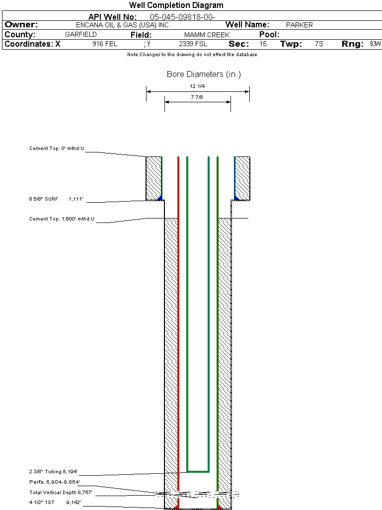 | Wellbore Completed | | Completion Date: | 7/12/2004 | | Spud Date: | 3/30/2004 | Spud Date Is: | ACTUAL | | Measured TD: | 9142 ft. | Measured PB depth: | 9070 ft. | | True Vertical TD: | 8757 ft. | True Vertical PB depth: | 0 ft. | | Top PZ Location: | Sec:14 Twp: | Footage: 1980 FSL 660 FWL | | Bottom Hole Location: | Sec:14 Twp: | Footage: 1980 FSL 660 FWL | | Log Types: | GR-RST, GR-CBL, GR-TEMP.LOG | | Casing: | String Type: SURF, Hole Size: 12.25 in., Size: 8.625 in., Top: 0 ft., Depth: 1111 ft., Weight: 24 , Citings Type: ACTUAL | | Cement: | Sacks: 625, Top: 0 ft., Bottom: 1115 ft., Determination Method: CBL | | Casing: | String Type: 1ST, Hole Size: 7.875 in., Size: 4.5 in., Top: 0 ft., Depth: 9142 ft., Weight: 11.6 , Citings Type: ACTUAL | | Cement: | Sacks: 1395, Top: 1600 ft., Bottom: 9142 ft., Determination Method: CALC | | Formation | Interval Top | Log Bottom | Cored | DSTs | | WASATCH | 0 ft. | 5934 ft. | N | N | | WILLIAMS FORK | 5935 ft. | 8969 ft. | N | N | | ROLLINS | 8970 ft. | 9142 ft. | N | N |