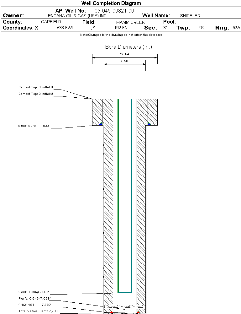 | Wellbore Completed | | Completion Date: | 3/10/2004 | | Spud Date: | 2/26/2004 | Spud Date Is: | ACTUAL | | Measured TD: | 7740 ft. | Measured PB depth: | 7602 ft. | | True Vertical TD: | 7703 ft. | True Vertical PB depth: | | | Top PZ Location: | Sec:25 Twp: | Footage: 660 FSL 660 FEL | | Bottom Hole Location: | Sec:25 Twp: 7S 93W | Footage: 660 FSL 660 FEL | | Log Types: | CBL, PEX | | Casing: | String Type: SURF, Hole Size: 12.25 in., Size: 8.625 in., Top: 884 ft., Depth: 930 ft., Weight: 24 , Citings Type: ACTUAL | | Cement: | Sacks: 480, Top: 0 ft., Bottom: 930 ft., Determination Method: CALC | | Casing: | String Type: 1ST, Hole Size: 7.875 in., Size: 4.5 in., Top: 7696 ft., Depth: 7739 ft., Weight: 11.6 , Citings Type: ACTUAL | | Cement: | Sacks: 1145, Top: 0 ft., Bottom: 7740 ft., Determination Method: CBL | | Formation | Interval Top | Log Bottom | Cored | DSTs | | WASATCH | 0 ft. | 5059 ft. | N | N | | WILLIAMS FORK | 5060 ft. | 7740 ft. | N | N |