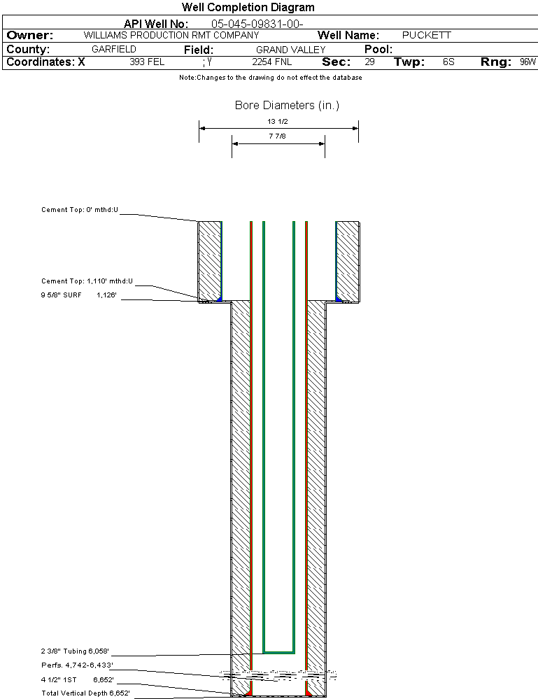 Wellbore #00 Wellbore Classification: GW Status: PR - 7/7/2004 Measured TD: 6662 ft. Vertical TD: 6652 ft.| Wellbore Data for Original Wellbore | Wellbore Classification: GW PR - 7/7/2004 | | Wellbore Permit | DIRECTIONAL | | Permit #: | 20040075 | Expiration Date: | 1/28/2005 | | Proposed Top PZ Location: | Sec: Twp: | Footage: 2105 FNL 559 FEL | | Bottom Hole Location: | Sec: Twp: | Footage: 2105 FNL 559 FEL | | Proposed Depth/Form: | 6735 ft. | | Surface Mineral Owner Same: | Yes | | Mineral Owner: | FEE | Surface Owner: | FEE | | Unit: | | Unit Number: | | | Formation And Spacing: | Code: WMFK , Formation: WILLIAMS FORK , Order: 139-38 , Unit Acreage: 160, Drill Unit: NE/4 |