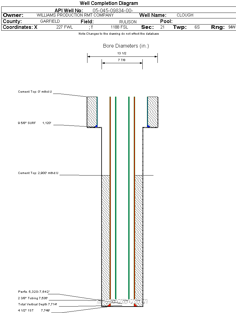 Wellbore #00 Wellbore Classification: GW Status: PR - 7/1/2004 Measured TD: 7762 ft. Vertical TD: 7714 ft.| Wellbore Data for Original Wellbore | Wellbore Classification: GW PR - 7/1/2004 | | Wellbore Permit | DIRECTIONAL | | Permit #: | 20040089 | Expiration Date: | 2/1/2005 | | Proposed Top PZ Location: | Sec: Twp: | Footage: 670 FSL 672 FWL | | Bottom Hole Location: | Sec: Twp: | Footage: 669 FSL 667 FWL | | Proposed Depth/Form: | 7765 ft. | | Surface Mineral Owner Same: | Yes | | Mineral Owner: | FEE | Surface Owner: | FEE | | Unit: | | Unit Number: | | | Formation And Spacing: | Code: WMFK , Formation: WILLIAMS FORK , Order: 139-38 , Unit Acreage: 320, Drill Unit: S/2 |