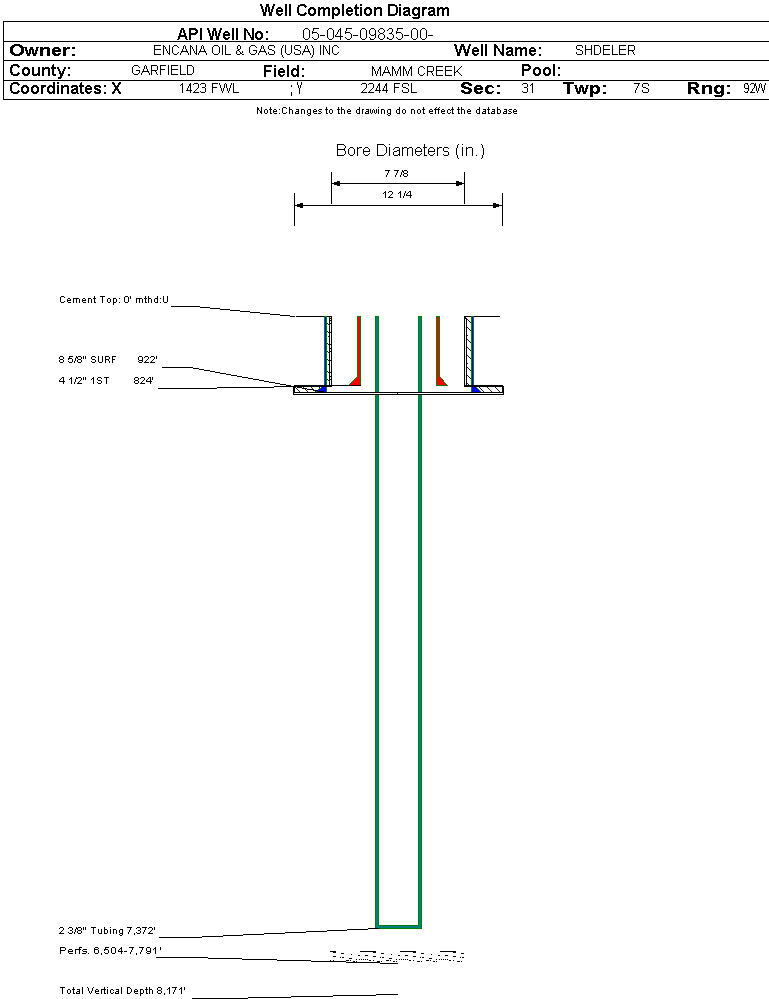 | Wellbore Completed | | Completion Date: | 5/13/2004 | | Spud Date: | 3/11/2004 | Spud Date Is: | ACTUAL | | Measured TD: | 8245 ft. | Measured PB depth: | 8041 ft. | | True Vertical TD: | 8171 ft. | True Vertical PB depth: | 7967 ft. | | Top PZ Location: | Sec:31 Twp: | Footage: 1320 FSL 1601 FWL | | Bottom Hole Location: | Sec:31 Twp: | Footage: 1320 FSL 1601 FWL | | Log Types: | PEX, CBL | | Casing: | String Type: SURF, Hole Size: 12.25 in., Size: 8.625 in., Top: , Depth: 922 ft., Weight: 24 , Citings Type: ACTUAL | | Cement: | Sacks: 475, Top: , Bottom: 922 ft., Determination Method: CALC | | Casing: | String Type: 1ST, Hole Size: 7.875 in., Size: 4.5 in., Top: , Depth: 824 ft., Weight: 11.6 , Citings Type: ACTUAL | | Cement: | Sacks: 1110, Top: 2360 ft., Bottom: 8245 ft., Determination Method: CBL | | Formation | Interval Top | Log Bottom | Cored | DSTs | | WASATCH | 0 ft. | 5148 ft. | N | N | | WILLIAMS FORK | 5149 ft. | 8166 ft. | N | N | | ROLLINS | 8167 ft. | 8245 ft. | N | N |