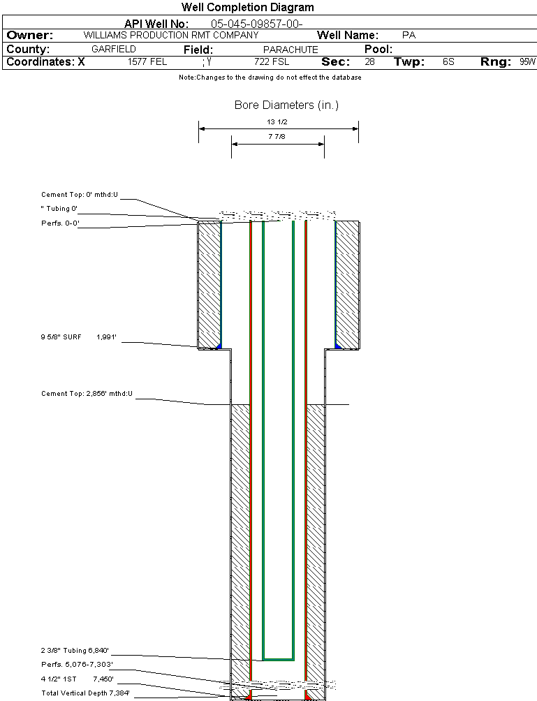 Wellbore #00 Wellbore Classification: GW Status: PR - 6/29/2004 Measured TD: 7465 ft. Vertical TD: 7384 ft.| Wellbore Data for Original Wellbore | Wellbore Classification: GW PR - 6/29/2004 | | Wellbore Permit | DIRECTIONAL | | Permit #: | 20040231 | Expiration Date: | 2/18/2005 | | Proposed Top PZ Location: | Sec: Twp: | Footage: 909 FSL 2320 FEL | | Bottom Hole Location: | Sec: Twp: | Footage: 915 FSL 2325 FEL | | Proposed Depth/Form: | 7455 ft. | | Surface Mineral Owner Same: | Yes | | Mineral Owner: | FEE | Surface Owner: | FEE | | Unit: | | Unit Number: | | | Formation And Spacing: | Code: WMFK , Formation: WILLIAMS FORK , Order: 139-38 , Unit Acreage: 320, Drill Unit: E/2 |