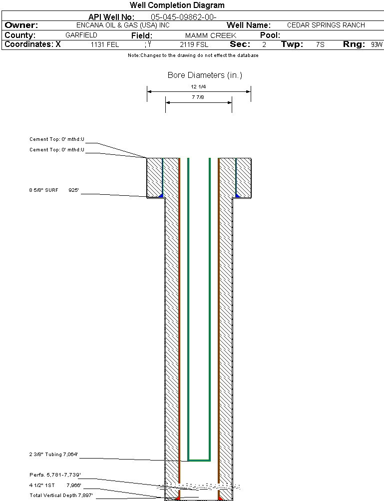 | Wellbore Completed | | Completion Date: | 8/5/2004 | | Spud Date: | 4/16/2004 | Spud Date Is: | ACTUAL | | Measured TD: | 7967 ft. | Measured PB depth: | 7938 ft. | | True Vertical TD: | 7897 ft. | True Vertical PB depth: | 7857 ft. | | Top PZ Location: | Sec:2 Twp: | Footage: 1310 FSL 1330 FEL | | Bottom Hole Location: | Sec:2 Twp: | Footage: 1310 FSL 1330 FEL | | Log Types: | GR-CBL,GR-PEX | | Casing: | String Type: SURF, Hole Size: 12.25 in., Size: 8.625 in., Top: 0 ft., Depth: 925 ft., Weight: 24 , Citings Type: ACTUAL | | Cement: | Sacks: 475, Top: 0 ft., Bottom: 925 ft., Determination Method: CALC | | Casing: | String Type: 1ST, Hole Size: 7.875 in., Size: 4.5 in., Top: 0 ft., Depth: 7966 ft., Weight: 11.6 , Citings Type: ACTUAL | | Cement: | Sacks: 1290, Top: 0 ft., Bottom: 7966 ft., Determination Method: CBL | | Formation | Interval Top | Log Bottom | Cored | DSTs | | WASATCH | 0 ft. | 4654 ft. | N | N | | WILLIAMS FORK | 4655 ft. | 7892 ft. | N | N | | ROLLINS | 7893 ft. | 7967 ft. | N | N |