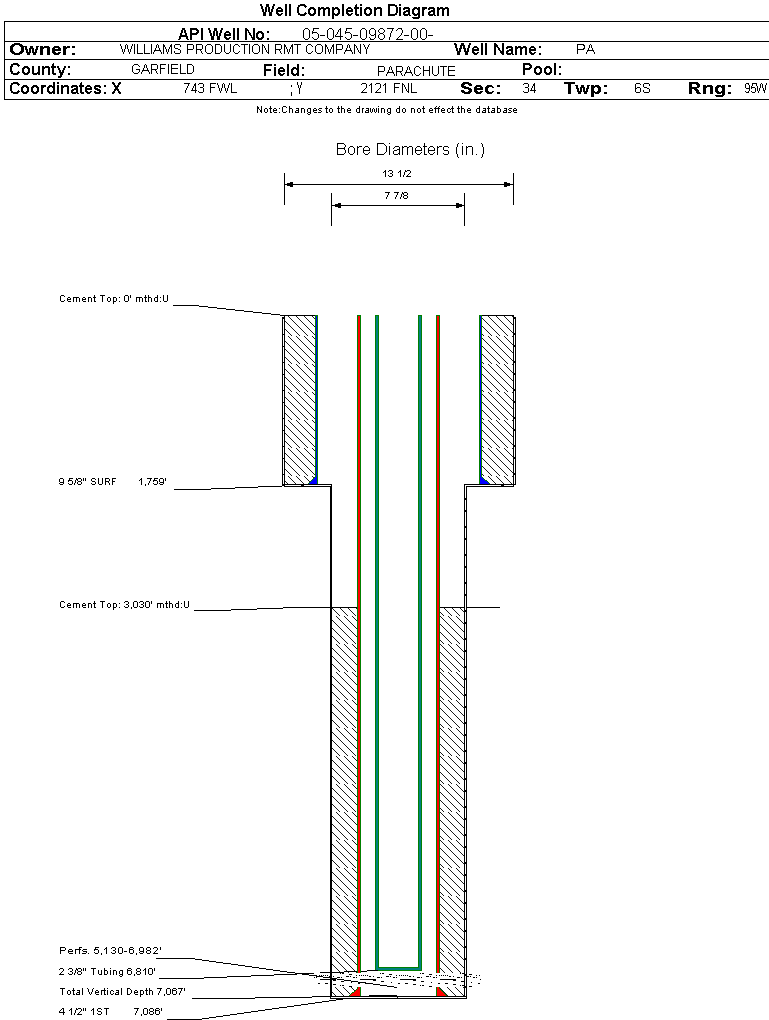 Wellbore #00 Wellbore Classification: GW Status: PR - 10/1/2020 Measured TD: 7119 ft. Vertical TD: 7067 ft.| Wellbore Data for Original Wellbore | Wellbore Classification: GW PR - 10/1/2020 | | Wellbore Permit | DIRECTIONAL | | Permit #: | 20040380 | Expiration Date: | 2/26/2005 | | Proposed Top PZ Location: | Sec: Twp: | Footage: 2454 FNL 167 FWL | | Bottom Hole Location: | Sec: Twp: | Footage: 2454 FNL 167 FWL | | Proposed Depth/Form: | 7175 ft. | | Surface Mineral Owner Same: | Yes | | Mineral Owner: | FEE | Surface Owner: | FEE | | Unit: | | Unit Number: | | | Formation And Spacing: | Code: WMFK , Formation: WILLIAMS FORK , Order: 139-38 , Unit Acreage: 320, Drill Unit: N/2 |