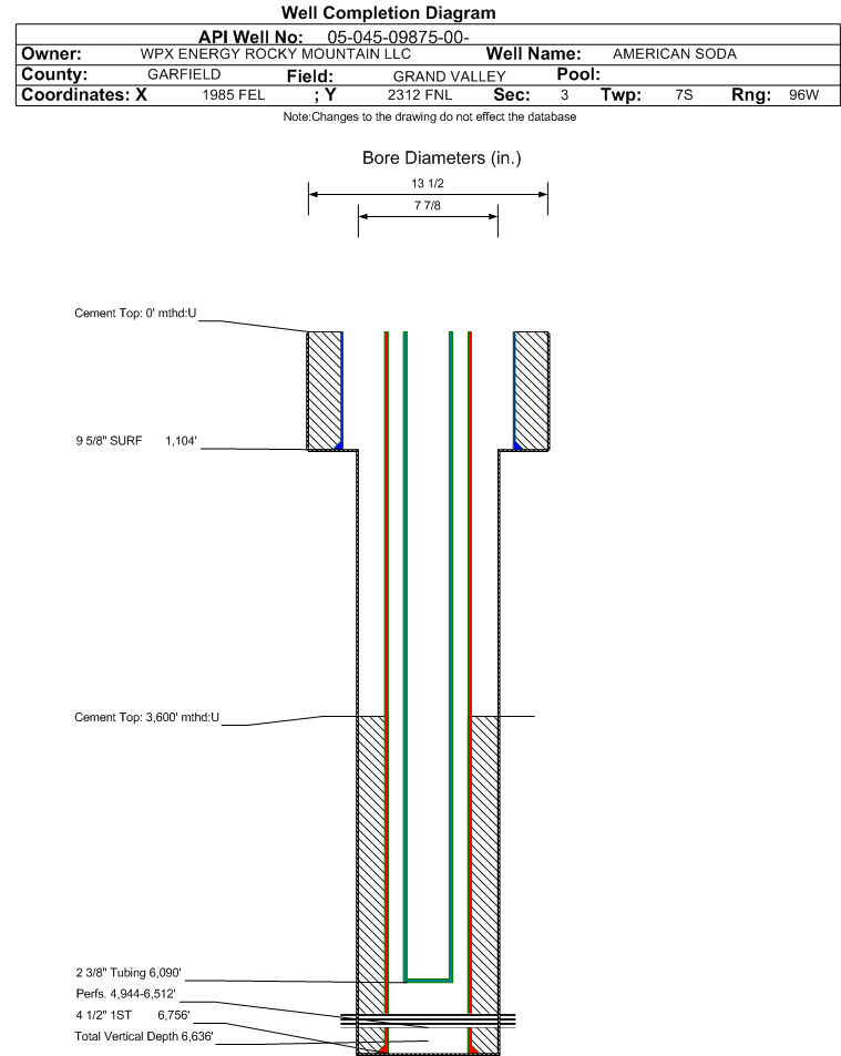 | Wellbore Completed | | Completion Date: | 5/27/2004 | | Spud Date: | 4/29/2004 | Spud Date Is: | ACTUAL | | Measured TD: | 6760 ft. | Measured PB depth: | 6647 ft. | | True Vertical TD: | 6636 ft. | True Vertical PB depth: | 6523 ft. | | Top PZ Location: | Sec:3 Twp: 7S 96W | Footage: 1320 FNL 1897 FEL | | Bottom Hole Location: | Sec:3 Twp: 7S 96W | Footage: 1320 FNL 1897 FEL | | Log Types: | HIGH RESOLUTION INDUCTION SPECTRAL DENSITY DUAL SPACED NEUTRON; CBL | | Casing: | String Type: SURF, Hole Size: 13.5 in., Size: 9.625 in., Top: , Depth: 1104 ft., Weight: 32.3 , Citings Type: ACTUAL | | Cement: | Sacks: 515, Top: 0 ft., Bottom: 1104 ft., Determination Method: | | Casing: | String Type: 1ST, Hole Size: 7.875 in., Size: 4.5 in., Top: , Depth: 6756 ft., Weight: 11.6 , Citings Type: ACTUAL | | Cement: | Sacks: 875, Top: 3600 ft., Bottom: 6756 ft., Determination Method: CBL | | Formation | Interval Top | Log Bottom | Cored | DSTs | | FORT UNION | 2177 ft. | | N | N | | MESAVERDE | 3653 ft. | | N | N | | CAMEO | 6123 ft. | | N | N | | ROLLINS | 6640 ft. | | N | N |