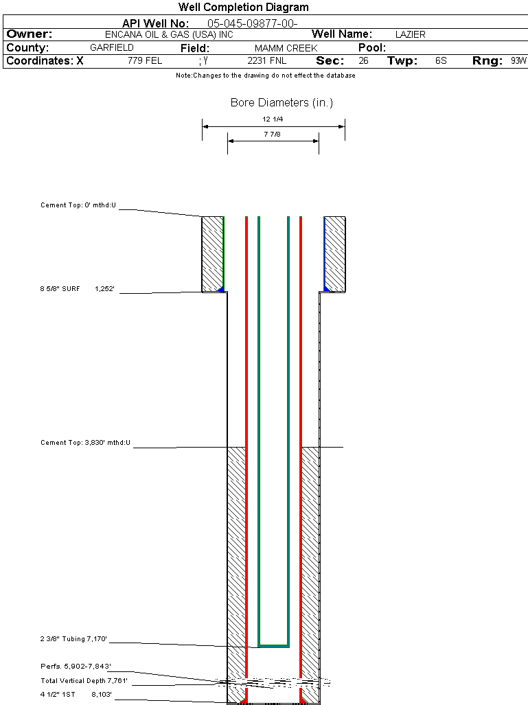 | Wellbore Completed | | Completion Date: | 7/17/2004 | | Spud Date: | 3/12/2004 | Spud Date Is: | ACTUAL | | Measured TD: | 8103 ft. | Measured PB depth: | 8042 ft. | | True Vertical TD: | 7761 ft. | True Vertical PB depth: | 0 ft. | | Top PZ Location: | Sec:26 Twp: | Footage: 650 FNL 10 FEL | | Bottom Hole Location: | Sec:26 Twp: 6S 93W | Footage: 650 FNL 10 FEL | | Log Types: | RST/GR, CBL/GR | | Casing: | String Type: SURF, Hole Size: 12.25 in., Size: 8.625 in., Top: 0 ft., Depth: 1252 ft., Weight: 24 , Citings Type: ACTUAL | | Cement: | Sacks: 605, Top: 0 ft., Bottom: 1252 ft., Determination Method: CALC | | Casing: | String Type: 1ST, Hole Size: 7.875 in., Size: 4.5 in., Top: 0 ft., Depth: 8103 ft., Weight: 11.6 , Citings Type: ACTUAL | | Cement: | Sacks: 1320, Top: 3830 ft., Bottom: 8103 ft., Determination Method: CBL | | Formation | Interval Top | Log Bottom | Cored | DSTs | | WASATCH | 0 ft. | 4974 ft. | N | N | | WILLIAMS FORK | 4975 ft. | 8103 ft. | N | N |