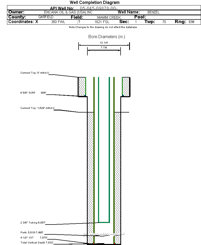 | Wellbore Completed | | Completion Date: | 5/27/2004 | | Spud Date: | 3/18/2004 | Spud Date Is: | ACTUAL | | Measured TD: | 7870 ft. | Measured PB depth: | 7745 ft. | | True Vertical TD: | 7832 ft. | True Vertical PB depth: | 7707 ft. | | Top PZ Location: | Sec:2 Twp: | Footage: 1330 FSL 10 FEL | | Bottom Hole Location: | Sec:2 Twp: | Footage: 1330 FSL 10 FEL | | Log Types: | RTS, CBL | | Casing: | String Type: SURF, Hole Size: 12.25 in., Size: 8.625 in., Top: 0 ft., Depth: 906 ft., Weight: 24 , Citings Type: ACTUAL | | Cement: | Sacks: 475, Top: 0 ft., Bottom: 906 ft., Determination Method: CALC | | Casing: | String Type: 1ST, Hole Size: 7.875 in., Size: 4.5 in., Top: 0 ft., Depth: 7870 ft., Weight: 11.6 , Citings Type: ACTUAL | | Cement: | Sacks: 1155, Top: 1628 ft., Bottom: 7870 ft., Determination Method: CBL | | Formation | Interval Top | Log Bottom | Cored | DSTs | | WASATCH | 0 ft. | 4797 ft. | N | N | | WILLIAMS FORK | 4789 ft. | 7735 ft. | N | N | | ROLLINS | 7736 ft. | 7870 ft. | N | N |